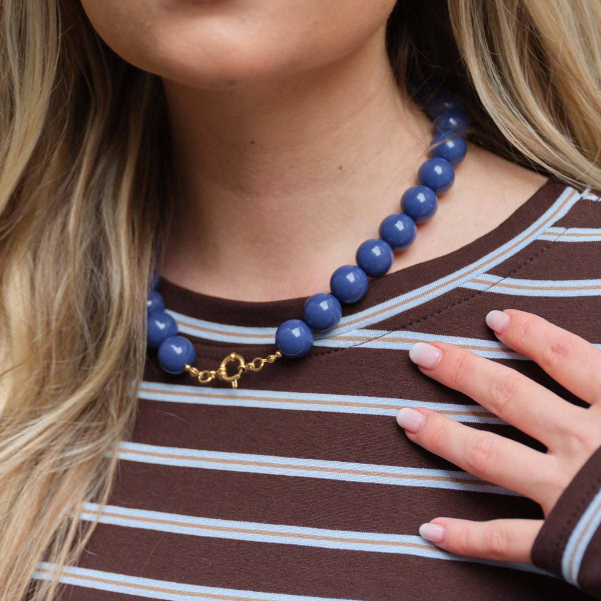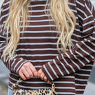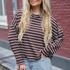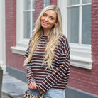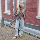 Deze Streep Top is een cropped essential die comfort en stijl moeiteloos combineert. De top heeft een tijdloos horizontaal streepdessin in een warme combinatie van donkerbruin en blauw. De wijde, oversized pasvorm, de ronde hals en de cropped lengte maken deze trui perfect om te combineren met een high-waist jeans.