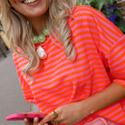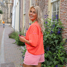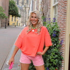 Het shirt is voorzien van opvallende horizontale strepen in helder oranje en zacht roze en is wat oversized. Combineer met een leuk shortje.