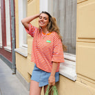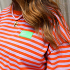 De top is uitgevoerd in een opvallende combinatie van paarse en oranje strepen, wat zorgt voor een unieke en energieke uitstraling. Het shirt heeft een comfortabele, losvallende pasvorm met 3/4 mouwen en een ronde halslijn, perfect voor een casual en toch gedurfde look. Een subtiele patch op de borst voegt een speels detail toe.