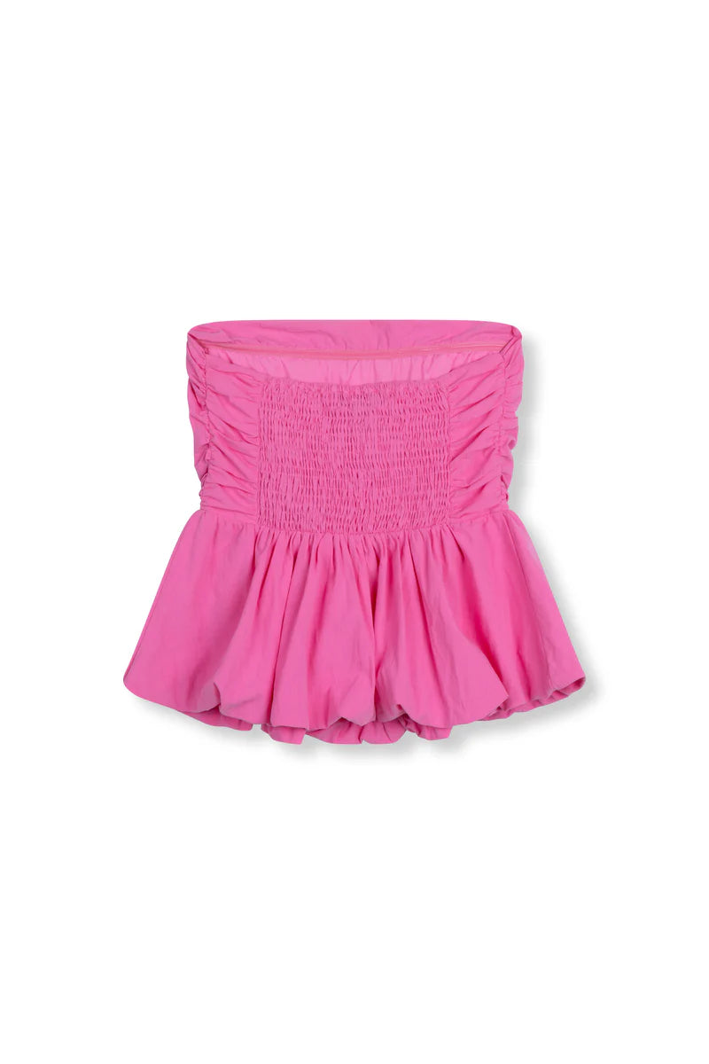 Deze elegante strapless top in de kleur pink is een perfecte aanvulling op je zomergarderobe. De top heeft een speels 'ballon' silhouet en is voorzien van elastiek aan de achterzijde, wat zorgt voor een comfortabele en aansluitende pasvorm. De binnenkant is verrijkt met een speciale 'jelly tape' om ervoor te zorgen dat de top perfect op zijn plaats blijft zitten, zonder af te zakken.