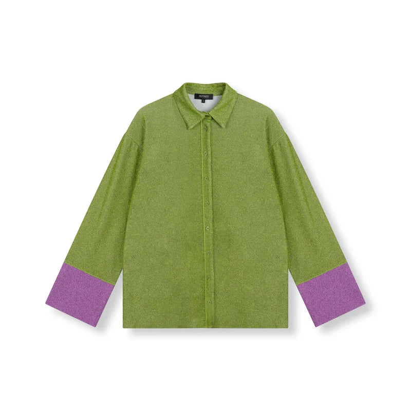 Dit comfortabele shirt is de perfecte mix van casual en stijlvol. De blouse heeft een opvallende glitterstof in de kleur groen met contrasterende paarse manchetten, en de zachte lurex stof voelt heerlijk aan op de huid. De relaxte pasvorm met verlaagde schoudernaden en de klassieke kraag maken het shirt ideaal voor een ontspannen en trendy look.