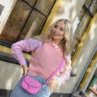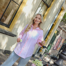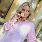 Mooie lichtroze blouse met streepjesprint. De blouse heeft mouwen en een boord in een donkere kleur roze. Combineer deze blouse met een leuke broek of rok om je look af te maken.
