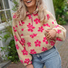 Deze heerlijk zachte en speelse Teddy Fleece Trui is de perfecte trui om je warm en vrolijk te houden. De trui is gemaakt van een zachte, crèmekleurige teddy fleece stof en is voorzien van een opvallend, all-over patroon van felroze bloemen. De hoge kraag met korte ritssluiting, de comfortabele buidelzak aan de voorkant en de elastische boord aan de onderkant geven deze trui een casual en behaaglijke look.