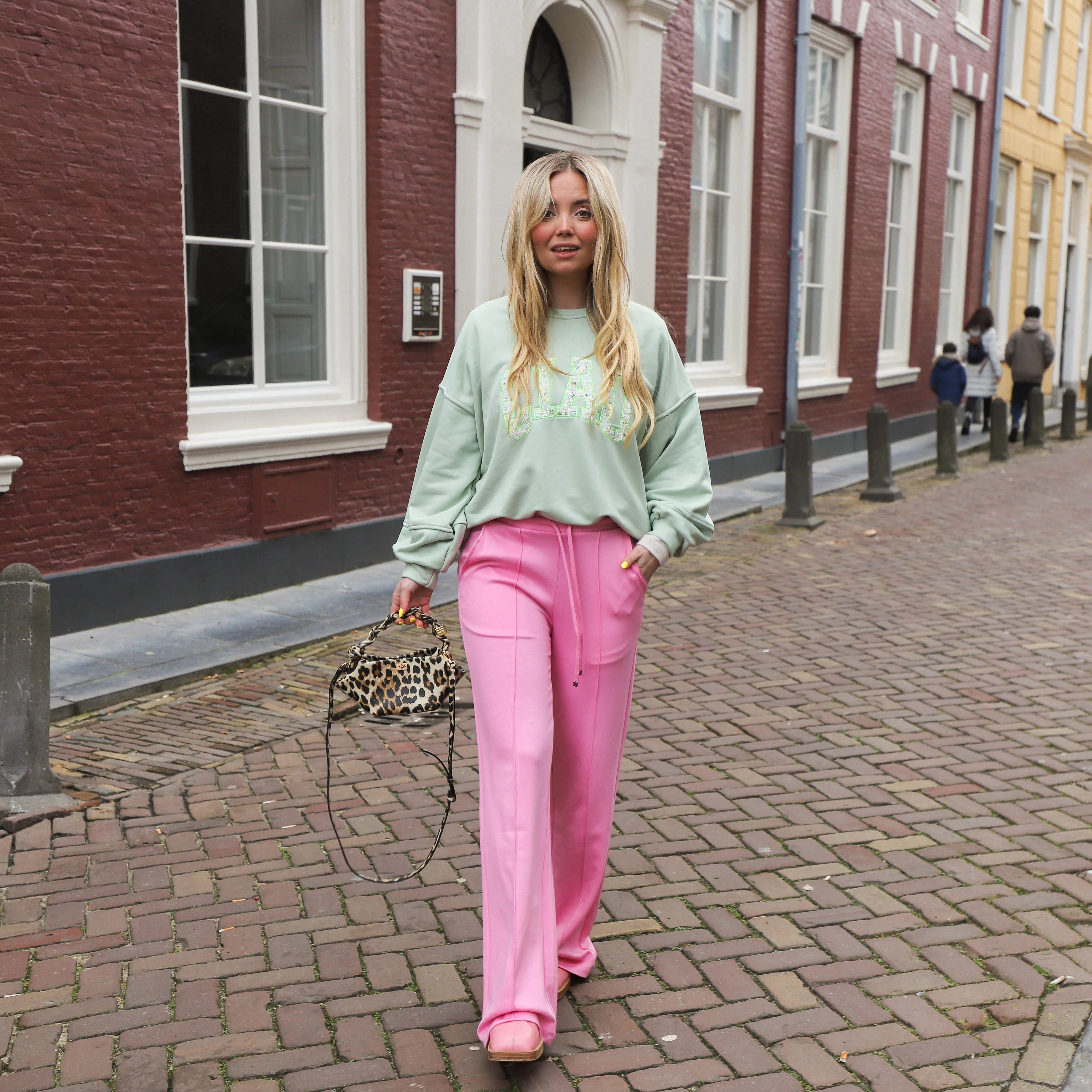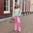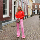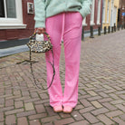 Mooie fuchsia broek van travel stof. De broek heeft een elastische tailleband, waardoor hij altijd mooi aangesloten zit. Combineer met een een witte blouse, net zoals ons model.