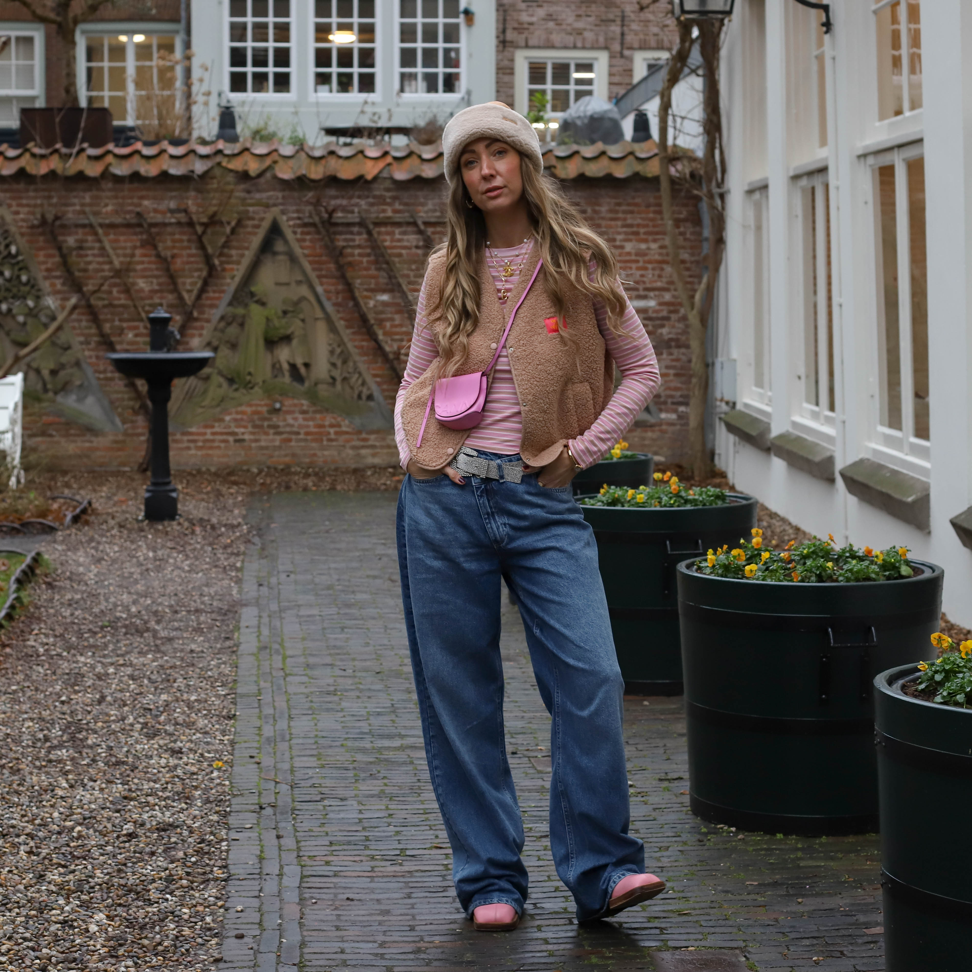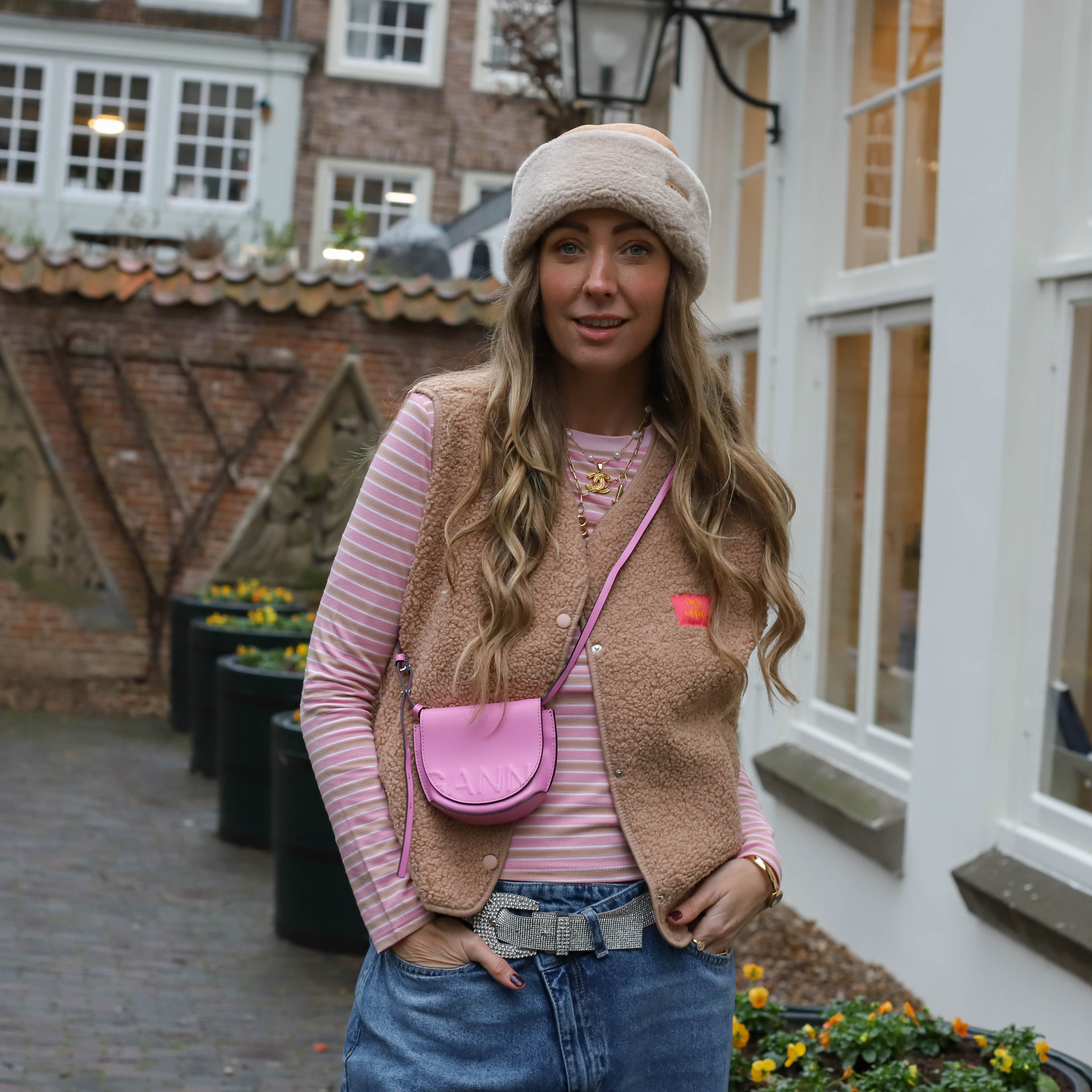 Streep gilet taupe roze