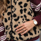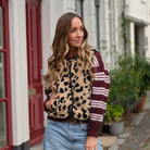 Dit trendy teddy gilet is een opvallend en heerlijk zacht statement piece. Het gilet heeft een opvallende panterprint in een neutrale combinatie van beige en zwarte vlekken. Het is uitgevoerd in een zachte, harige teddy-stof en is afgewerkt met een nette, zwarte bies langs de randen en de V-hals.