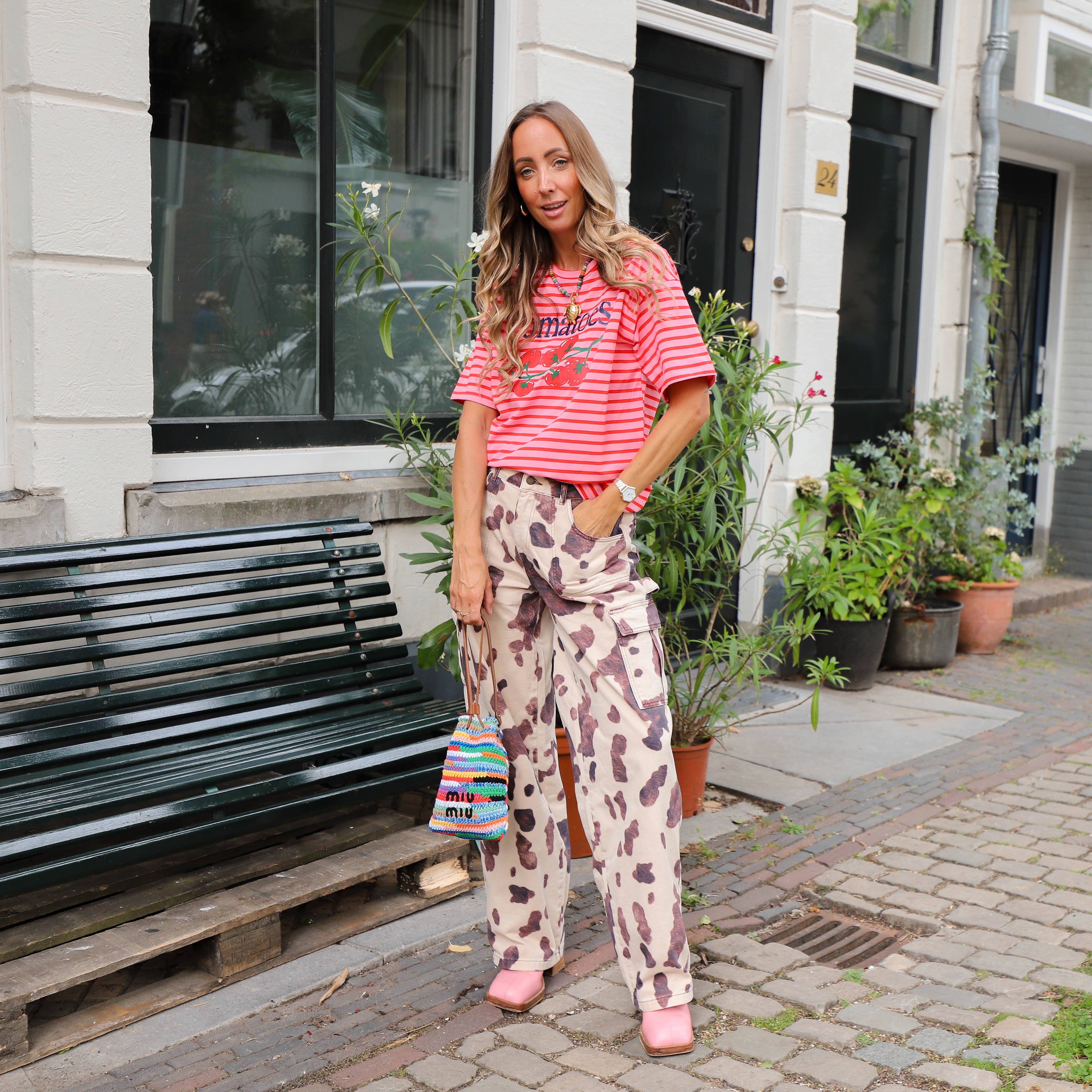 Een heerlijk fris shirt voor een zonnige dag! Dit 'tomato' streept-shirt in roze en rood is een vrolijke toevoeging aan elke garderobe. De opvallende 'Tomatoes' print met illustratie van tomaten geeft het shirt een unieke en speelse twist.