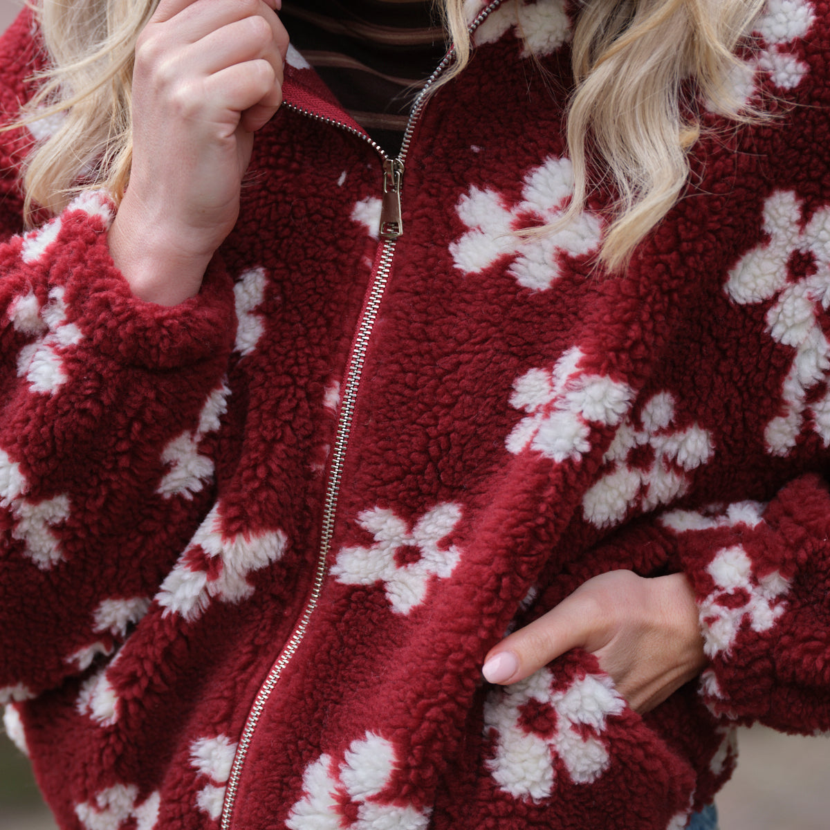 Deze Teddy Jas is een leuke jas, perfect om kleur en textuur toe te voegen aan je look. De jas is gemaakt van zachte teddy fleece en heeft een opvallende burgundy met een all-over patroon van lichte bloemen. De ritssluiting, de hoge opstaande kraag en de comfortabele pasvorm maken dit een ideale cropped tussenjas.