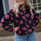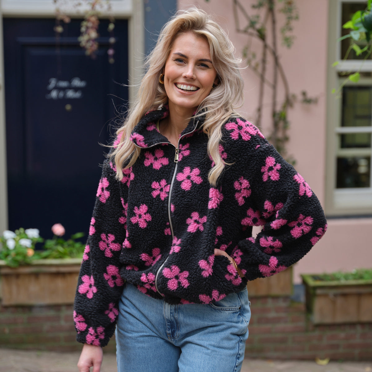 Deze Teddy Jas is een speelse en behaaglijke jas, perfect om kleur en textuur toe te voegen aan je look. De jas is gemaakt van zachte teddy fleece en heeft een opvallende donkergrijze/zwarte basis met een all-over patroon van fel roze bloemen. De ritssluiting, de hoge opstaande kraag en de comfortabele pasvorm maken dit een ideale cropped tussenjas.