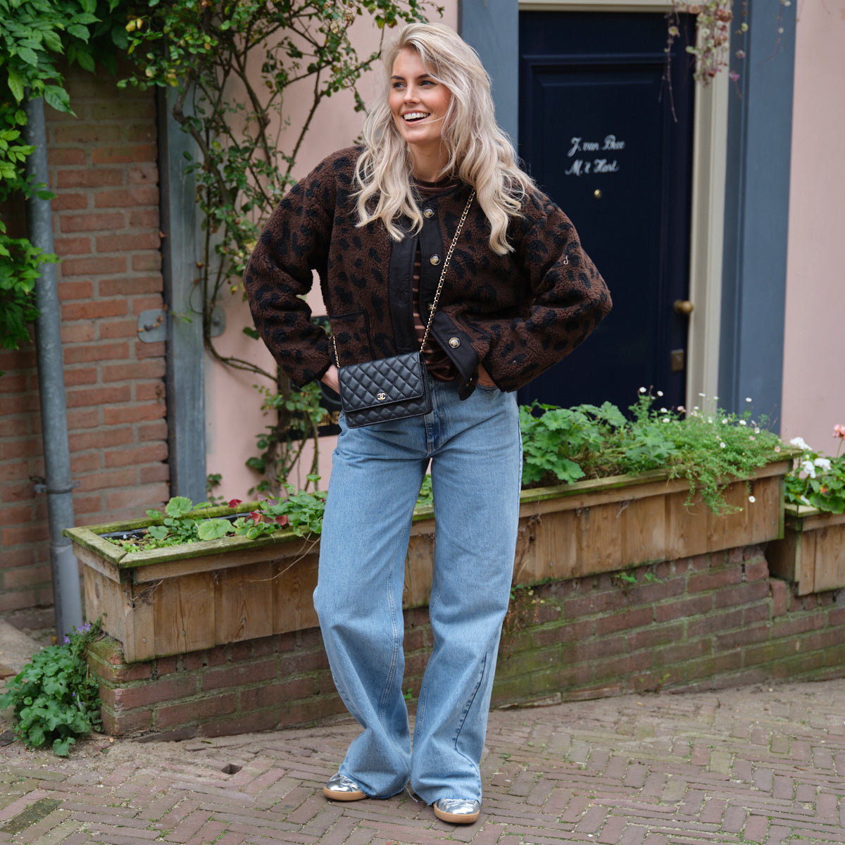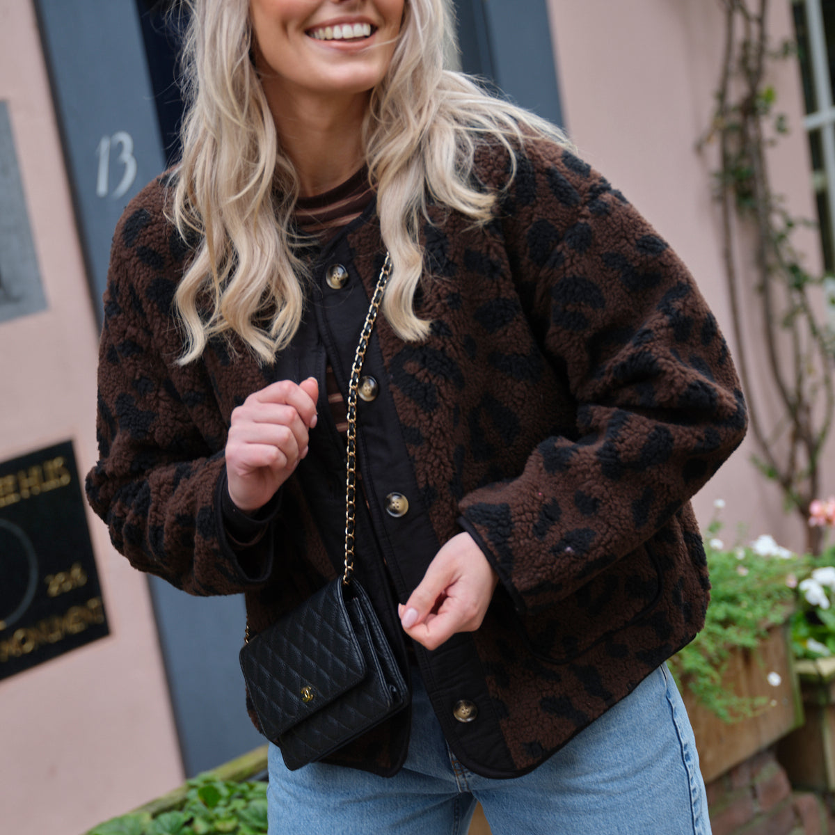 Deze Teddy Jas is een superzachte statement jas voor een speelse en warme look. De jas is gemaakt van teddy fleece en heeft een opvallende luipaardprint in zwart met bruin. De jas heeft een ronde hals en wordt afgemaakt met een effen zwarte bies langs de knoopsluiting en de zakken. Style 'm met een zwarte jeans en een coltrui om de rijke texturen en kleuren perfect tot hun recht te laten komen.