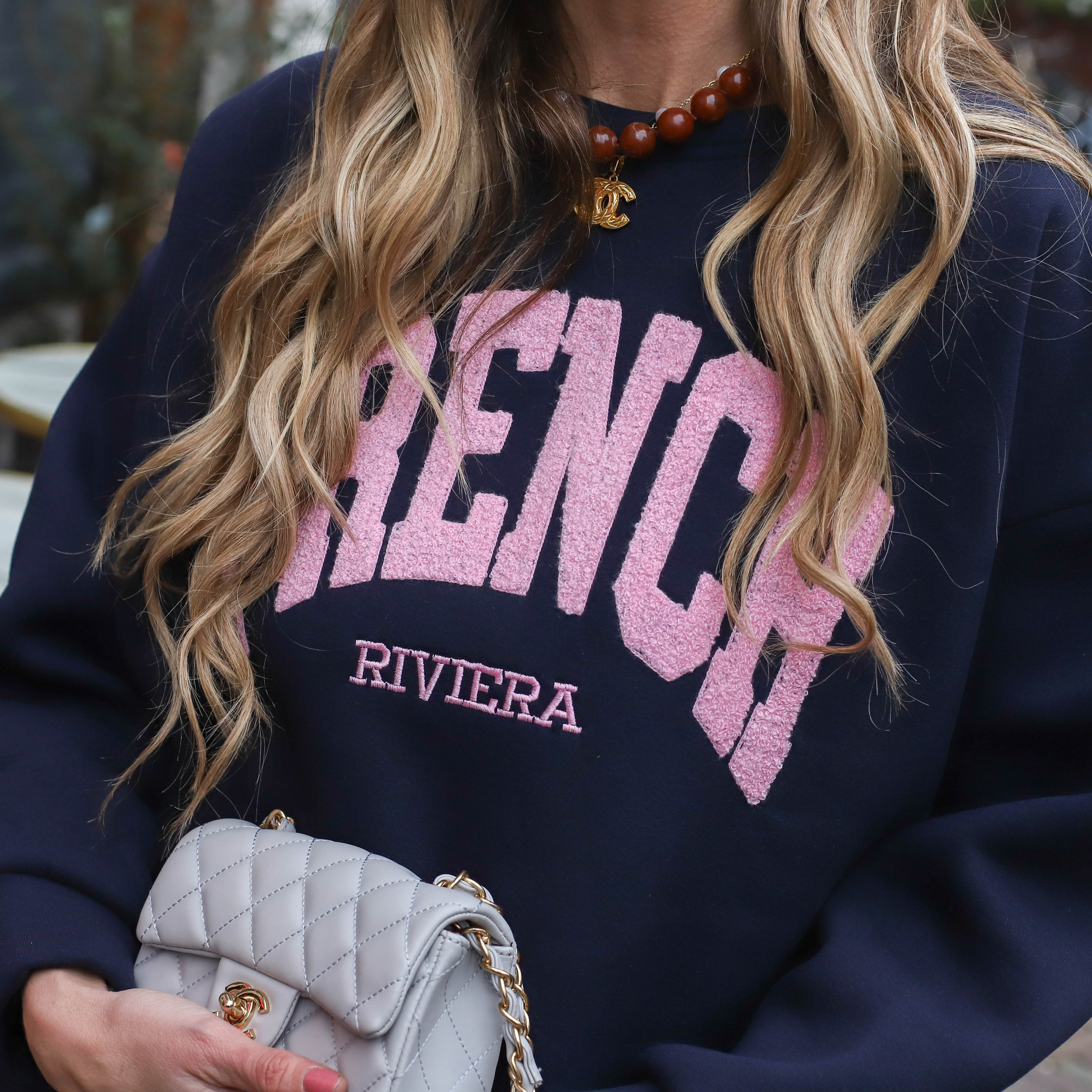 Deze French Riviera Sweatshirt is een frisse en sportieve toevoeging aan je collectie, ideaal voor een relaxte maar stijlvolle look. De sweater trekt direct de aandacht door de opvallende "FRENCH" applicatie in een badstof-structuur, subtiel aangevuld met de tekst "RIVIERA" in strak borduurwerk. Met zijn oversized pasvorm, klassieke ronde hals en zachte binnenvoering biedt deze trui het ultieme draagcomfort voor elke dag.