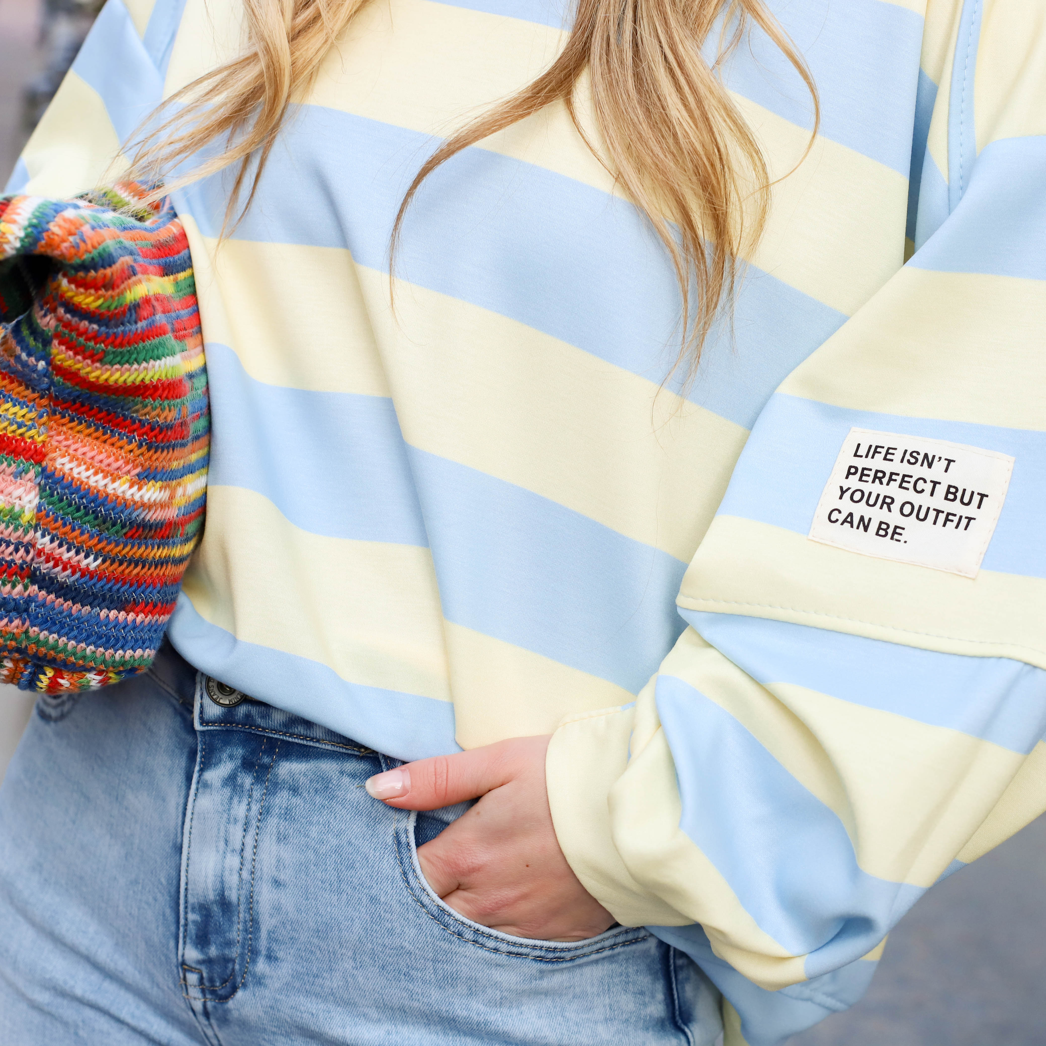 Deze Streep Sweater Life is een absolute favoriet voor een ontspannen en trendy look. De trui kenmerkt zich door een breed streeppatroon en een unieke patch op de mouw met de tekst "Life isn't perfect but your outfit can be". Dankzij de extreem baggy fit met verlaagde schouders en brede mouwen creëer je in een handomdraai een modern en nonchalant silhouette.