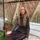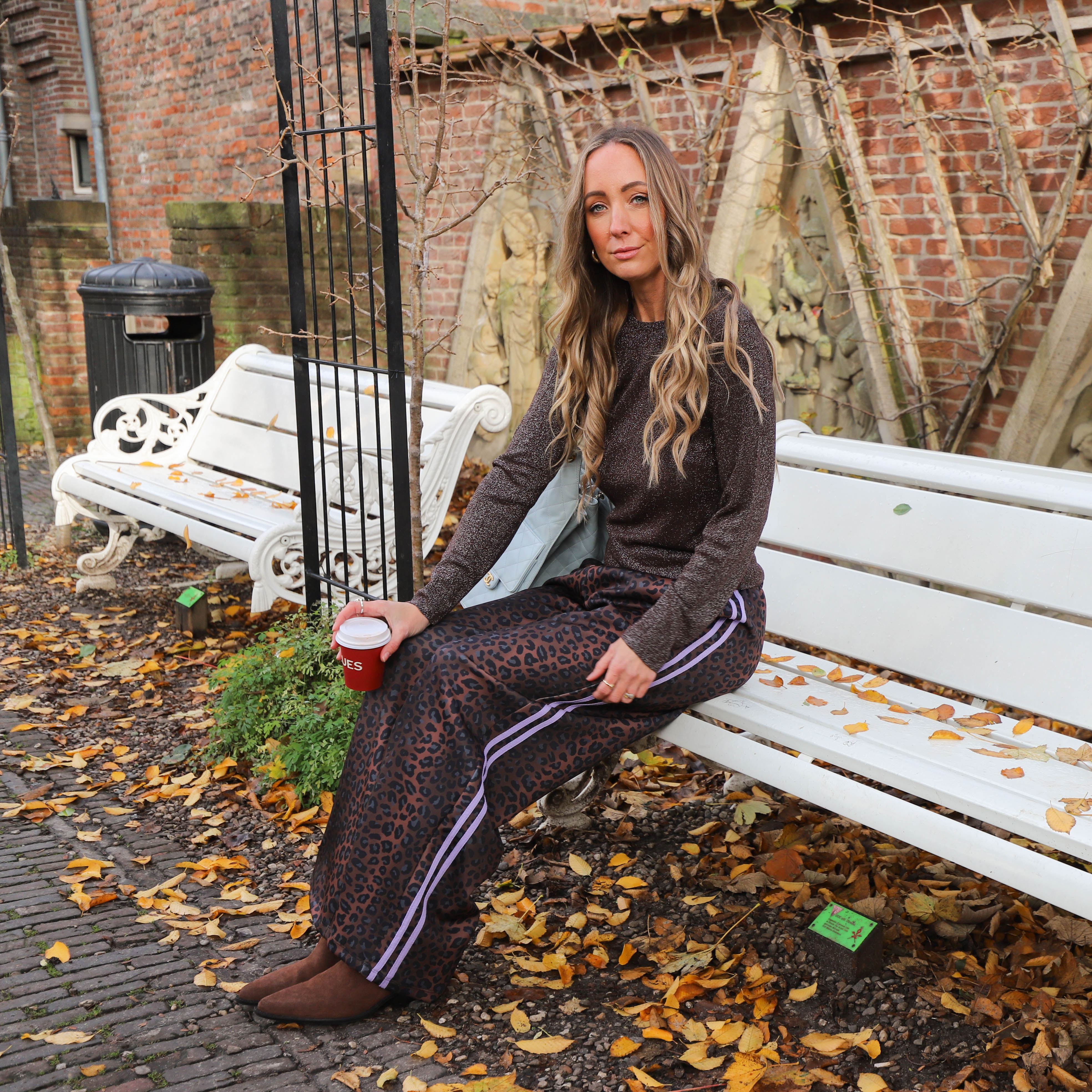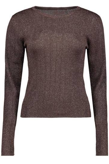 Deze Salima knit is een elegante en feestelijke toevoeging aan je garderobe. De top is gemaakt van een fijngebreide stof in een diepbruine 'fudge' kleur en heeft een all-over zilverkleurige metallic glans.