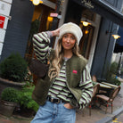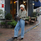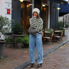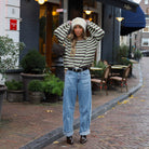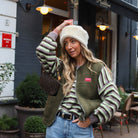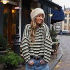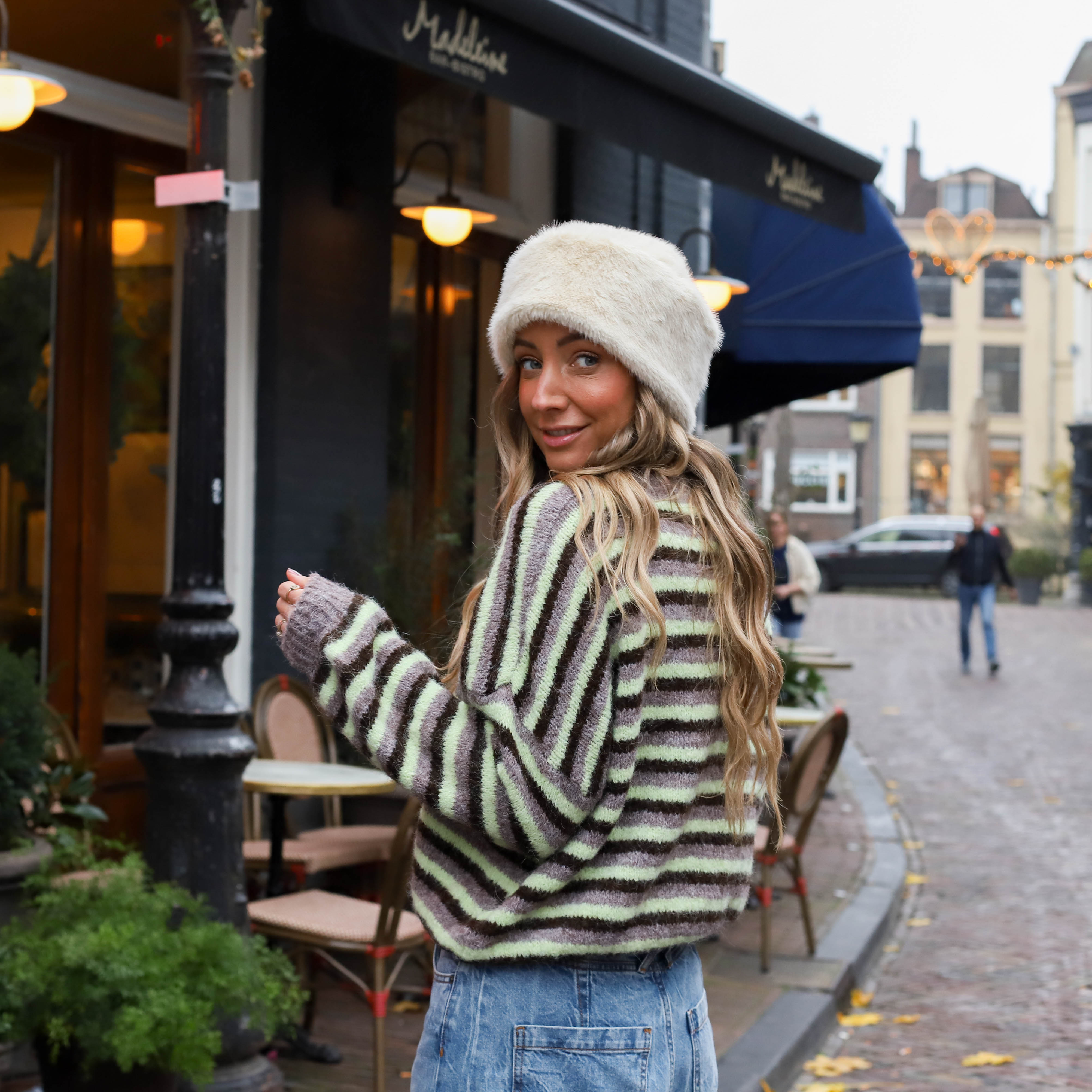 Deze Poppy Streep Trui is een zachte en harige knitwear. De trui is grof gebreid met brede horizontale strepen in roze, bruin en grijs. De trui heeft een klassieke ronde hals en een ruime, cropped pasvorm.