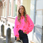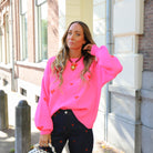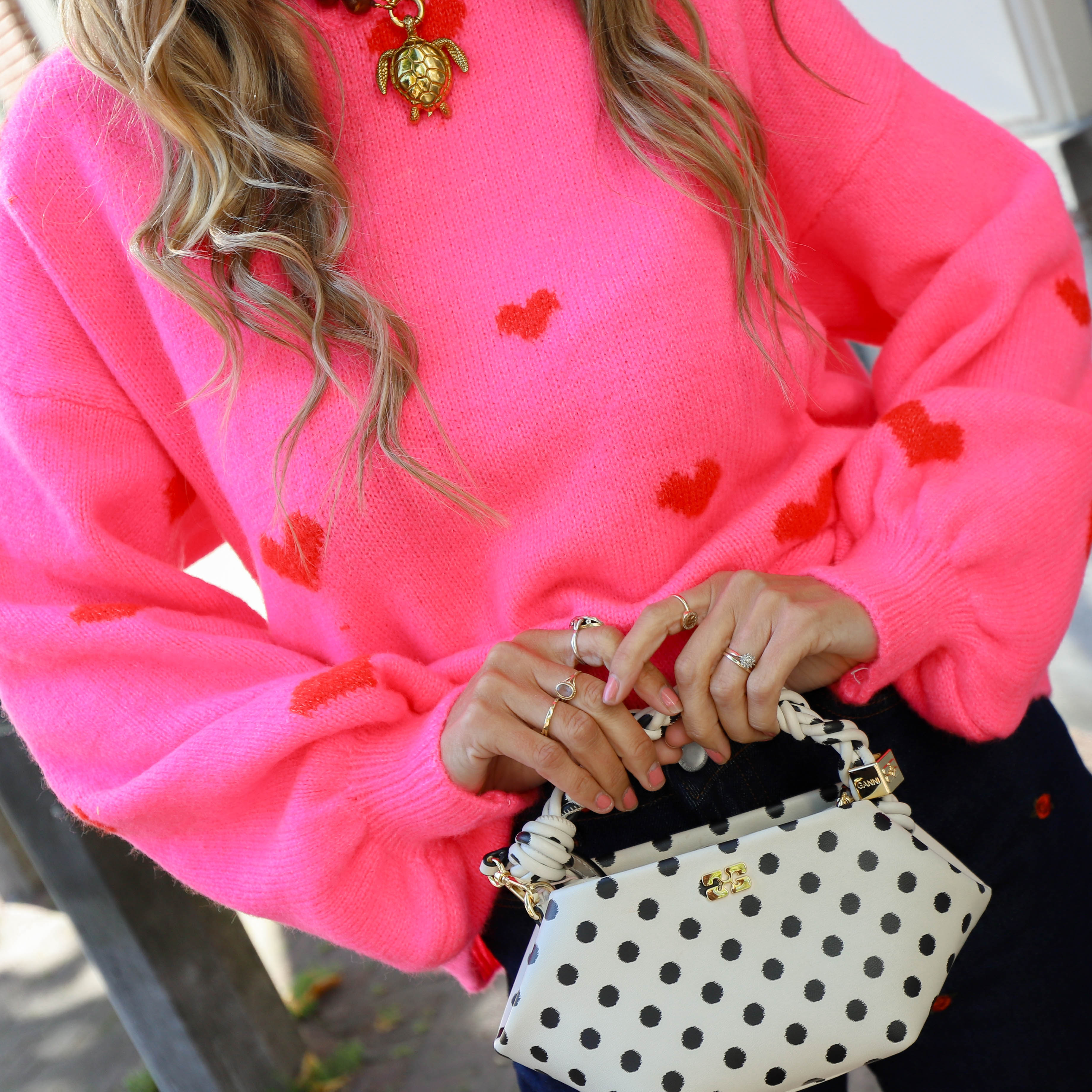 Deze zachte, felroze trui is de perfecte toevoeging aan je garderobe. De trui heeft een ronde hals en is versierd met kleine, rode hartjes, waardoor hij een speelse en vrolijke uitstraling heeft.De comfortabele, gebreide stof is ideaal voor een casual dag thuis of een leuke dag uit.