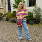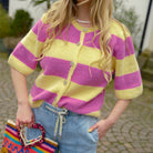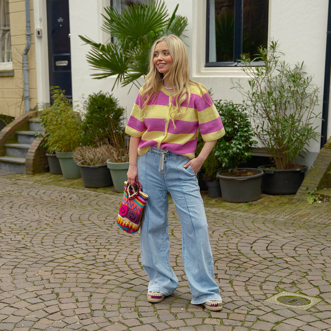 Schattig vestje met roze en gele strepen. Het vestje sluit met knoopjes en is heerlijk zacht.