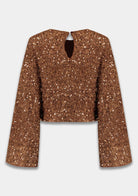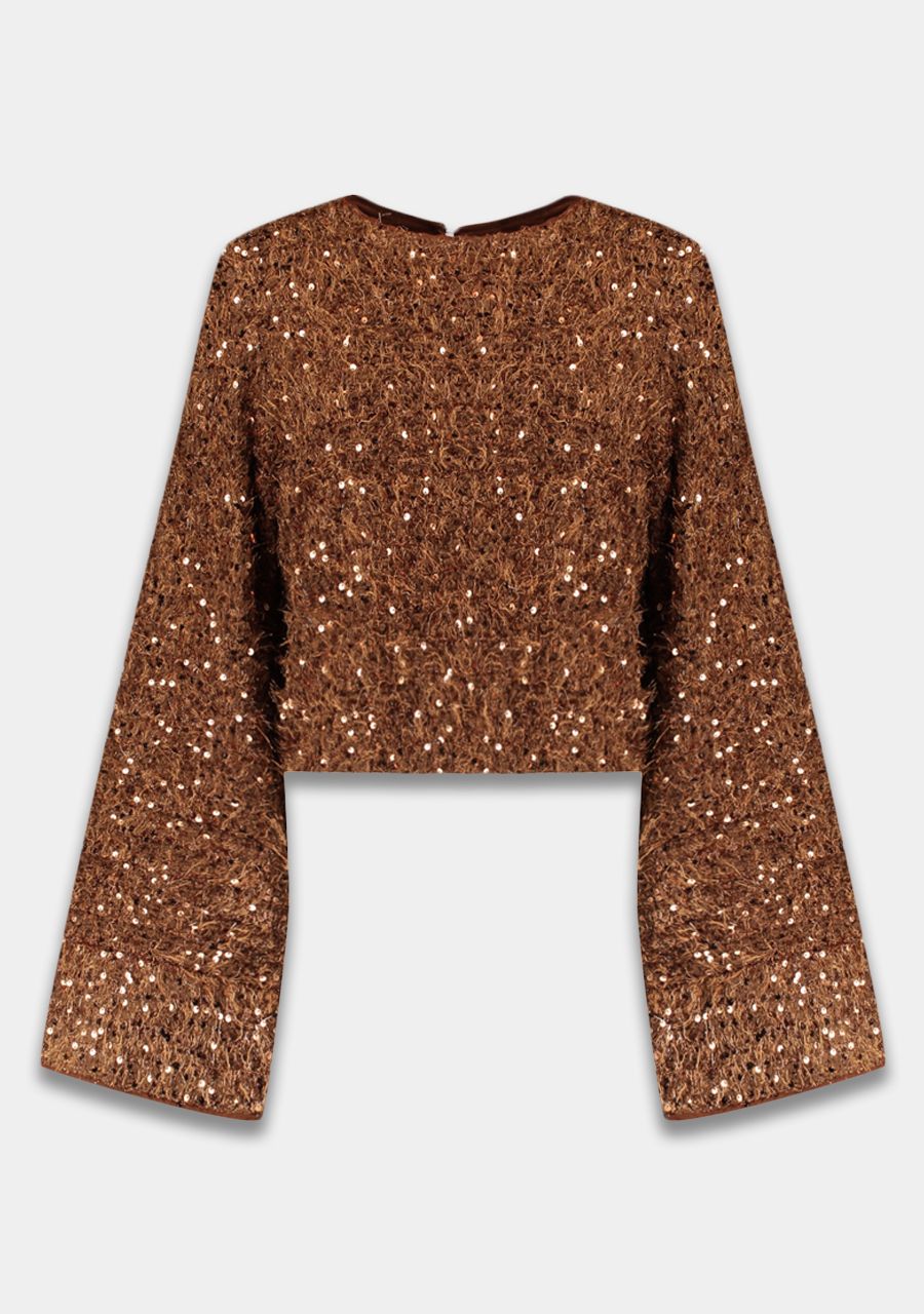 Mooie blouse vol glitters in een bronze kleur. De top heeft lange mouwen en zit heerlijk. Comfortabel, speels en ready to shine.
