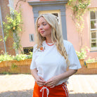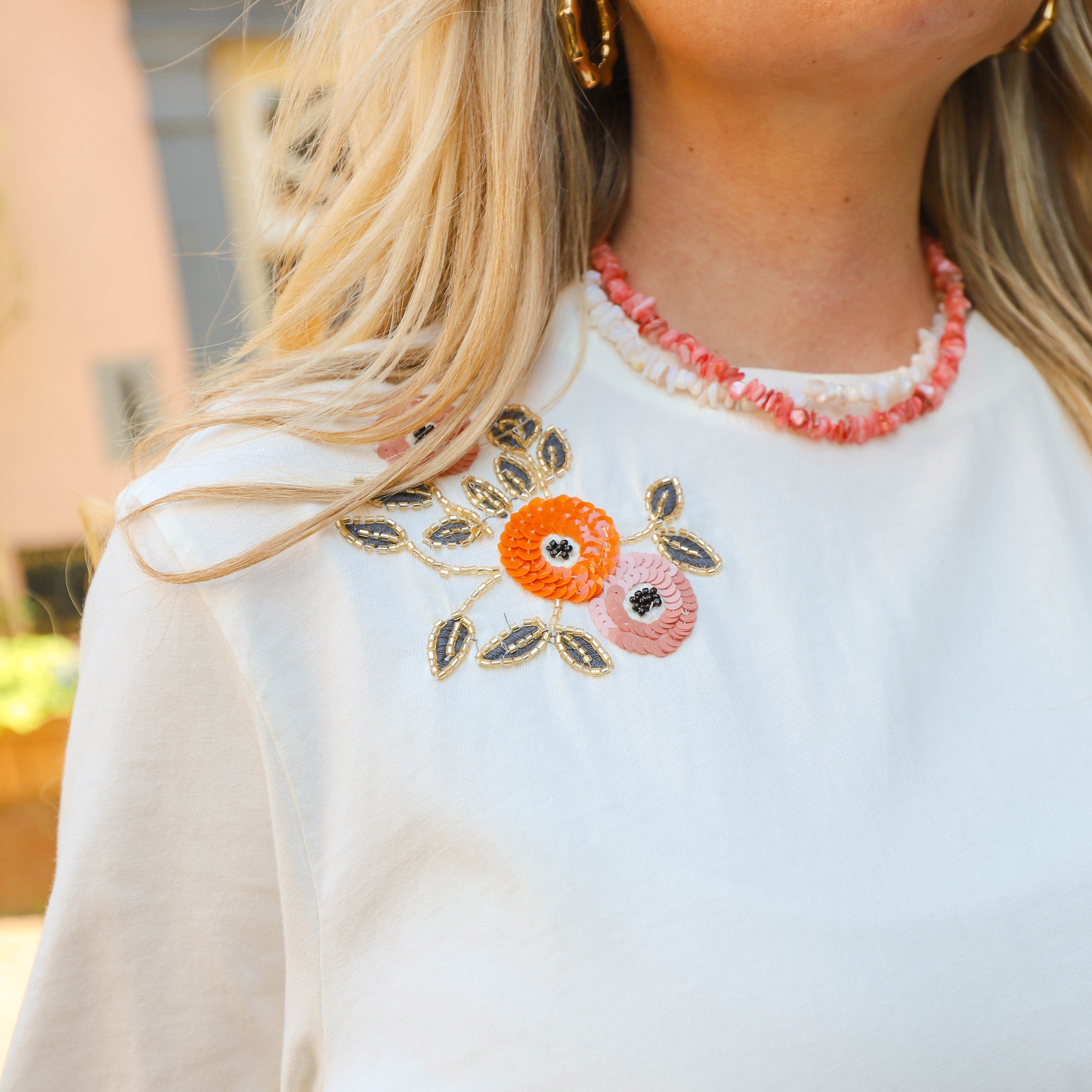 Breng een vleugje kleur in je dag met dit witte, boxy T-shirt met korte mouwen. De linkerborst is verfraaid met een prachtig geborduurd bloemenmotief in warme oranje- en roze tinten, geaccentueerd met groen. De boxy pasvorm zorgt voor een moderne en comfortabele look.
