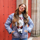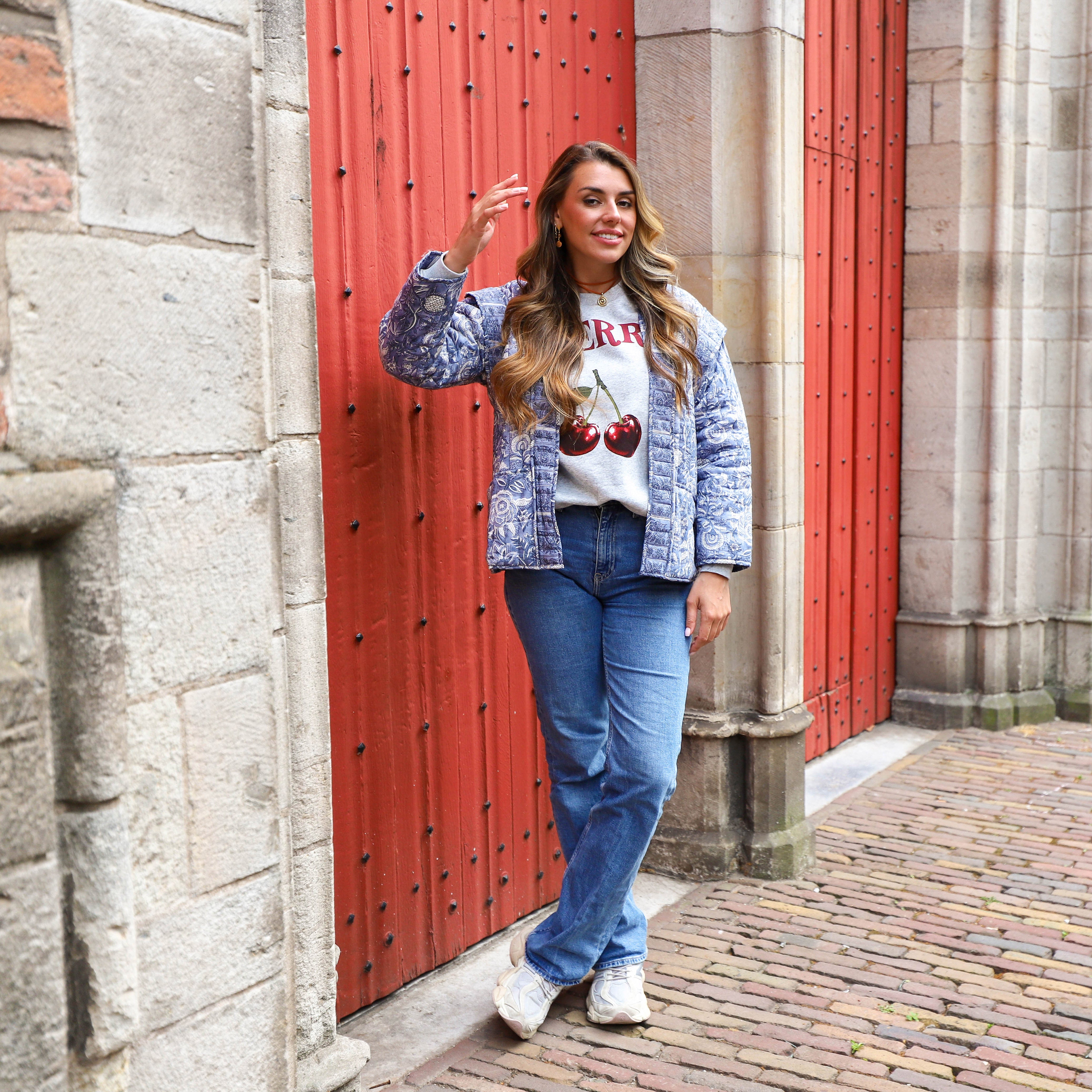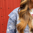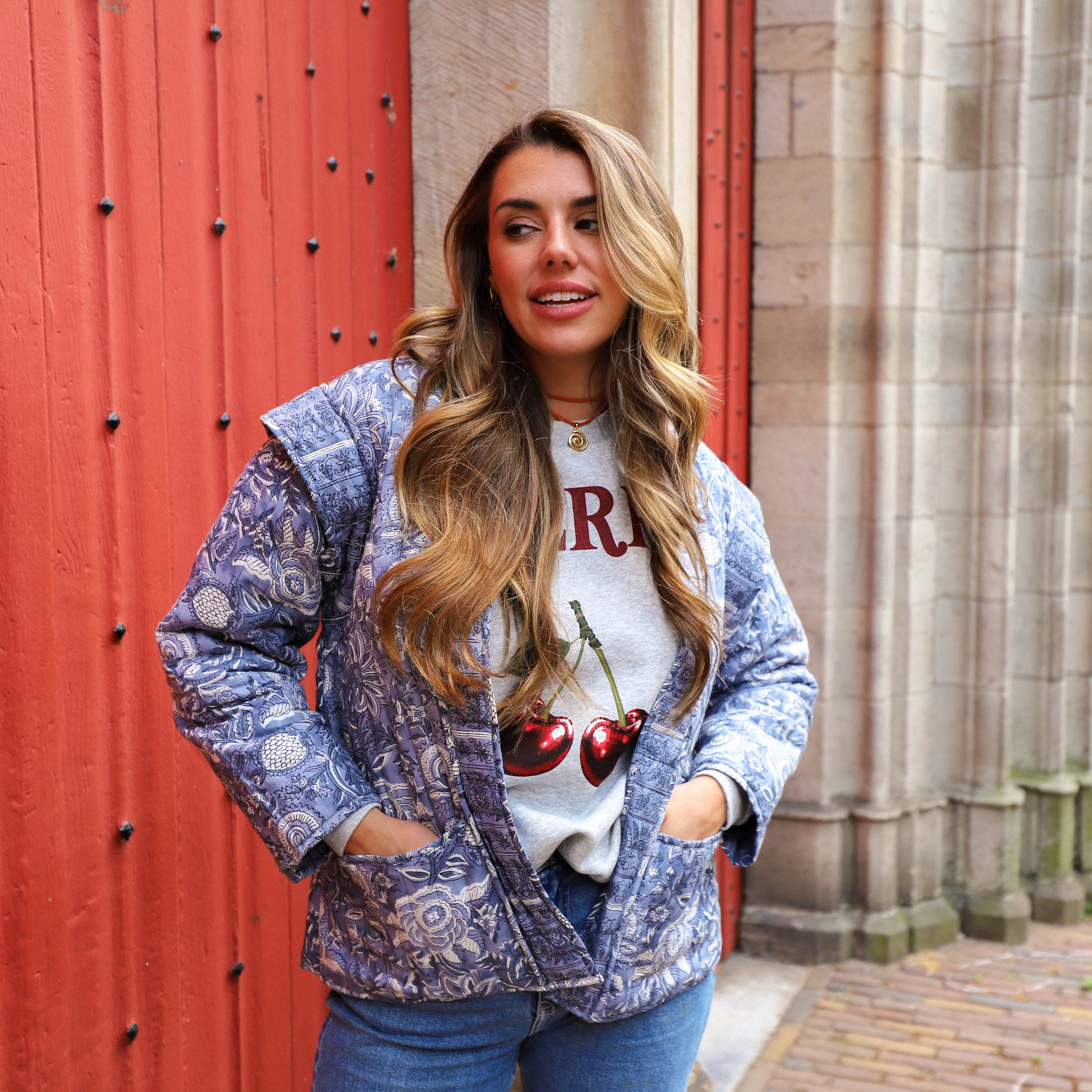 Het schattige jasje is uitgevoerd in een diepblauwe tint en voorzien van een prachtige all-over print van gedetailleerde paisley-achtige motieven en sierlijke bloemdessins in wit en lichtblauw. Vrolijkt elke outfit op!
