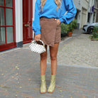 Dit unieke shortrokje in een mooie cafébruine tint combineert de look van een rok met het comfort van een short. De overslag aan de voorkant geeft het een speelse uitstraling.Dit shortrokje is de perfecte basis voor verschillende looks. Combineer het met een casual T-shirt en sneakers, of draag het met een leuke top en enkellaarsjes voor een avondje uit.