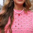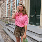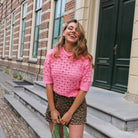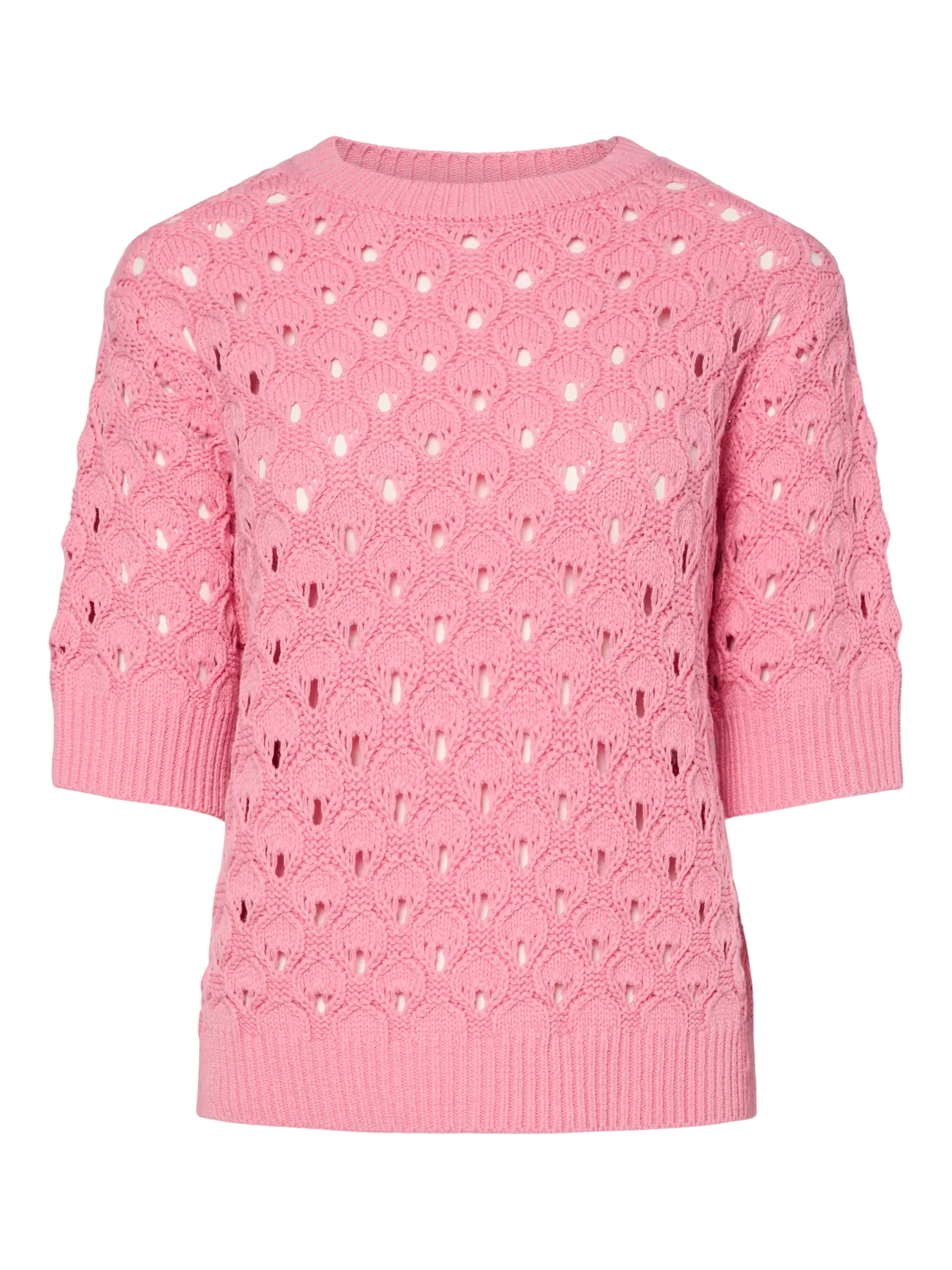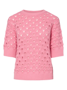 Deze roze trui is voorzien van een delicaat gebreid ajourpatroon, wat zorgt voor een elegante en speelse look. De korte mouwen en de comfortabele pasvorm maken dit de perfecte trui voor de warmere dagen van de lente en zomer.