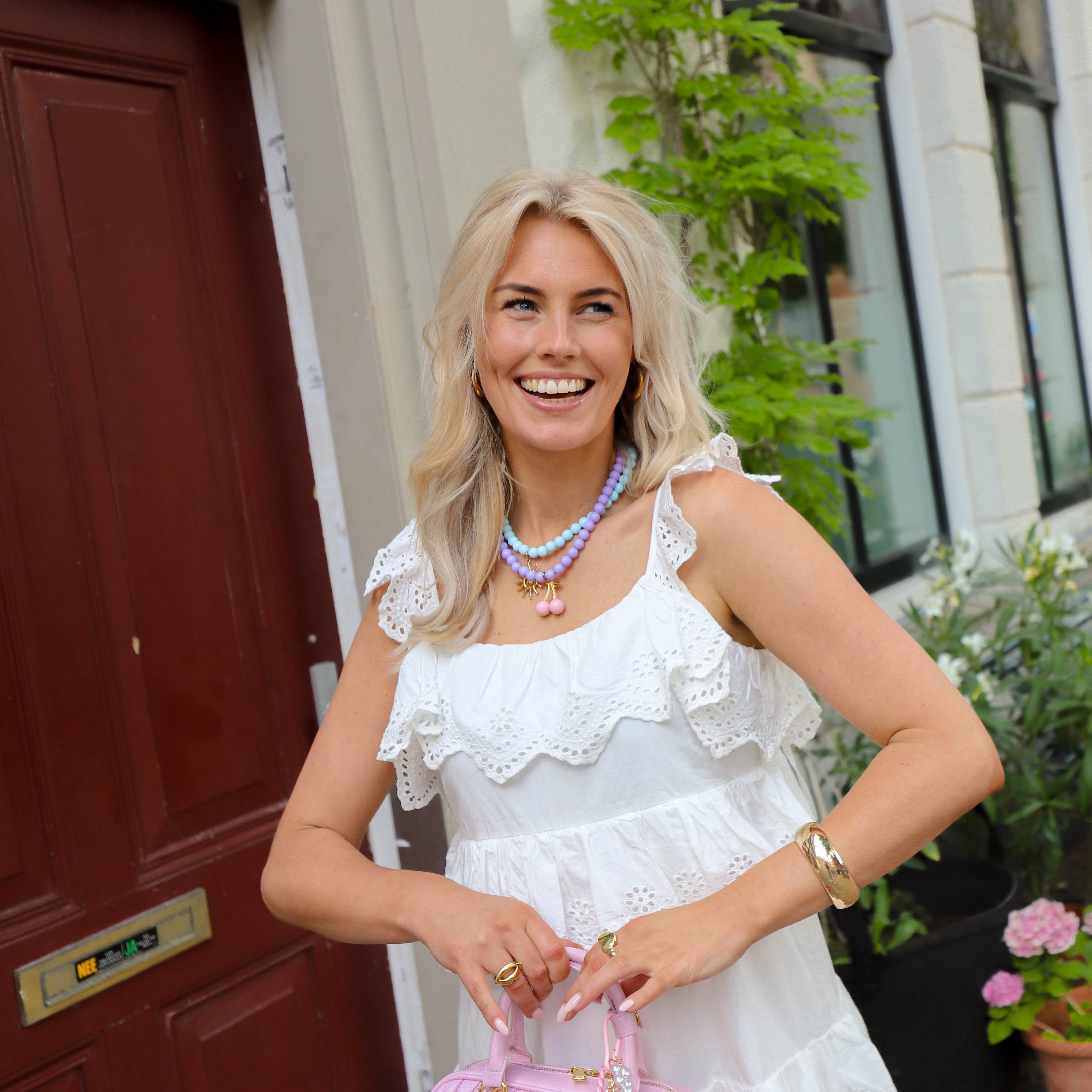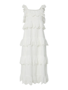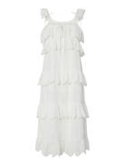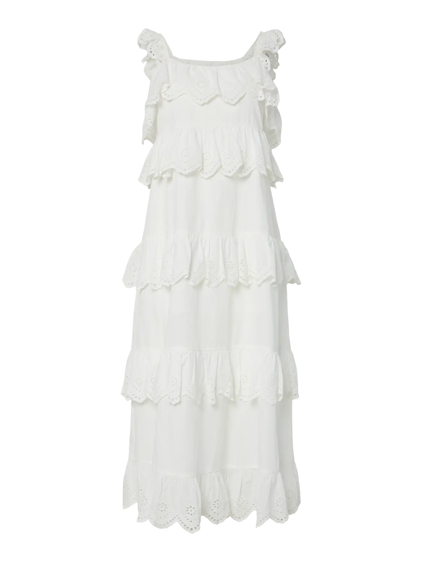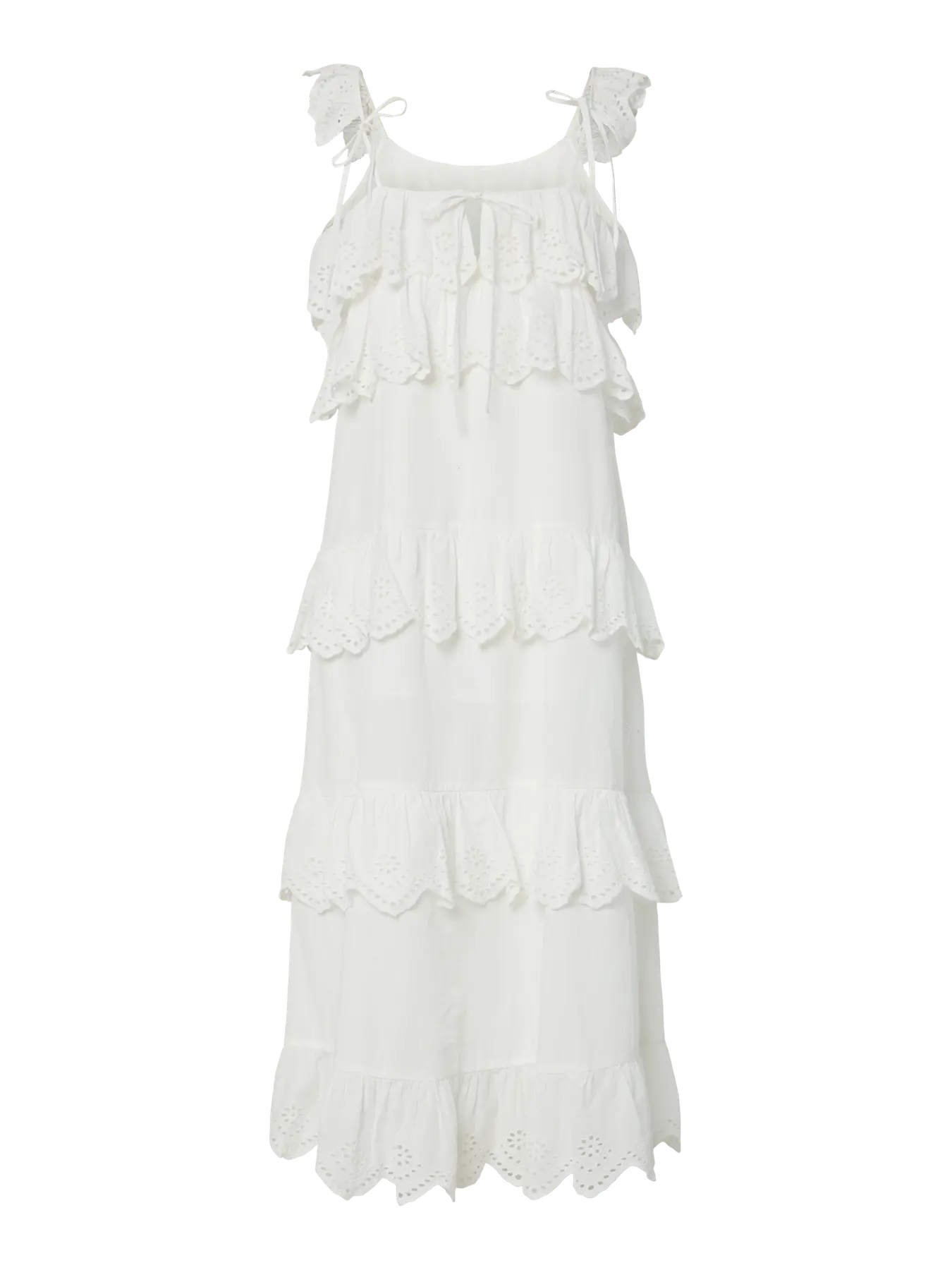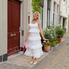 Mooie witte lange jurk met spaghettibandjes en off-shoulder ruches. De jurk is versierd met broderie anglaise details en heeft meerdere lagen met ruches, wat zorgt voor een speels en romantisch effect.
