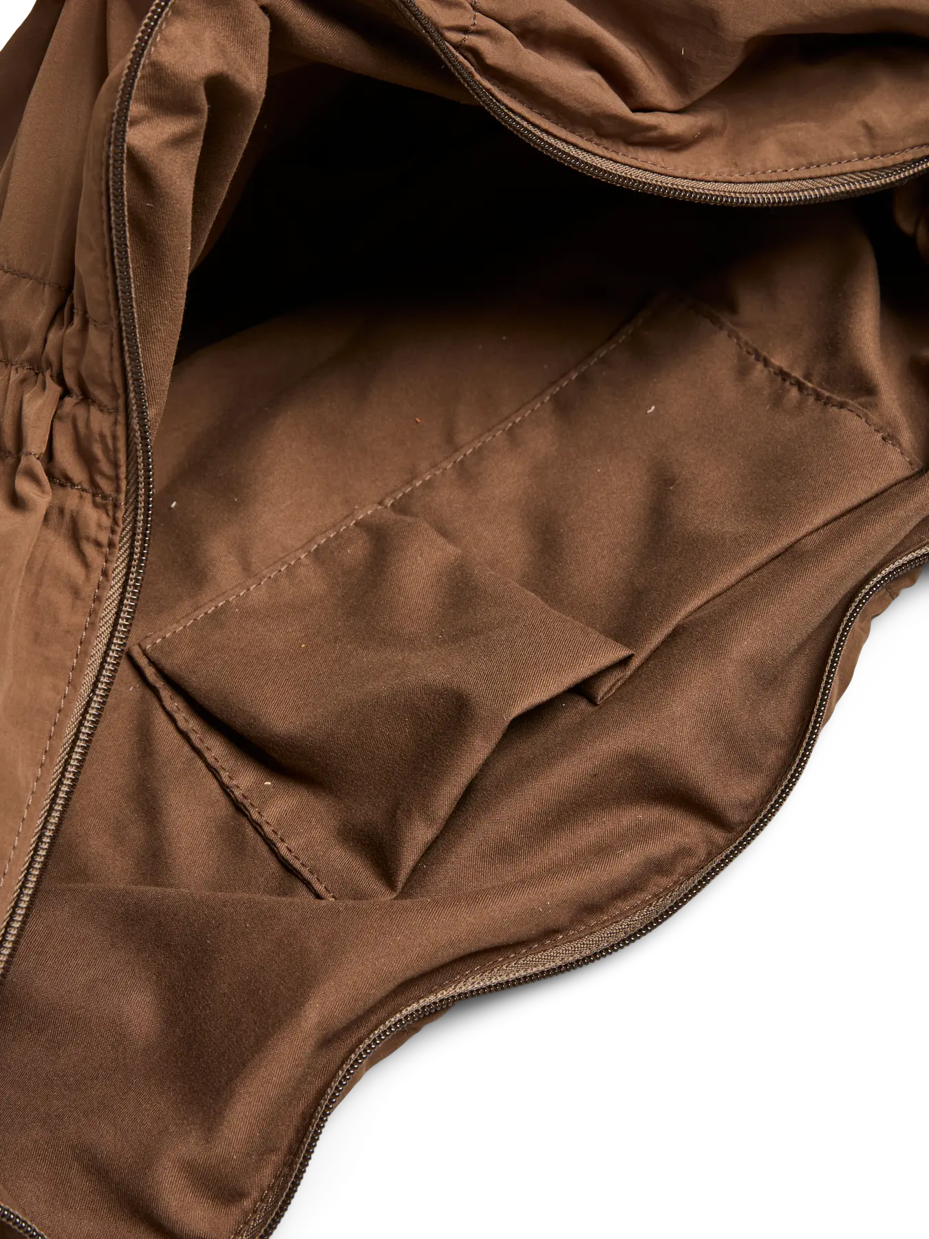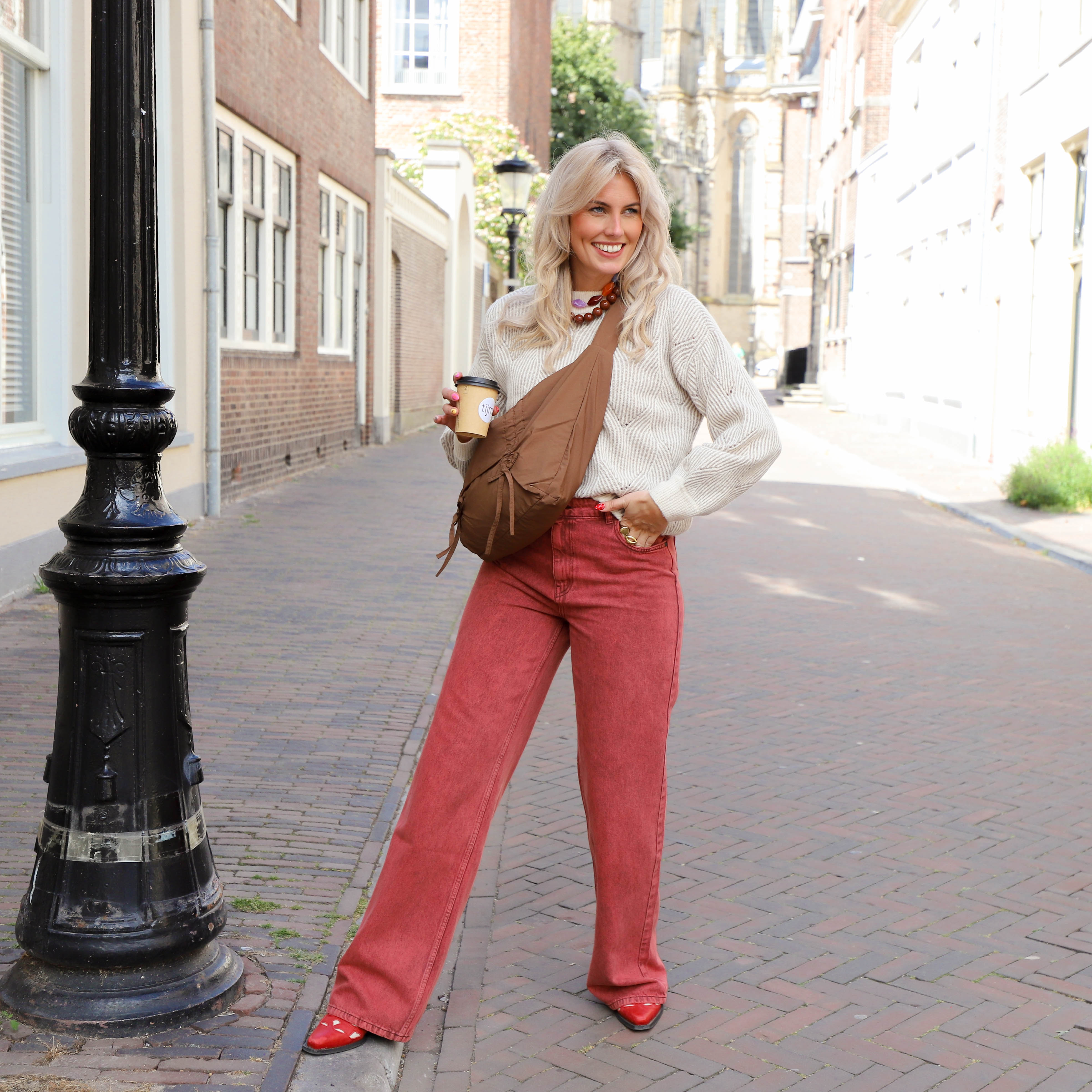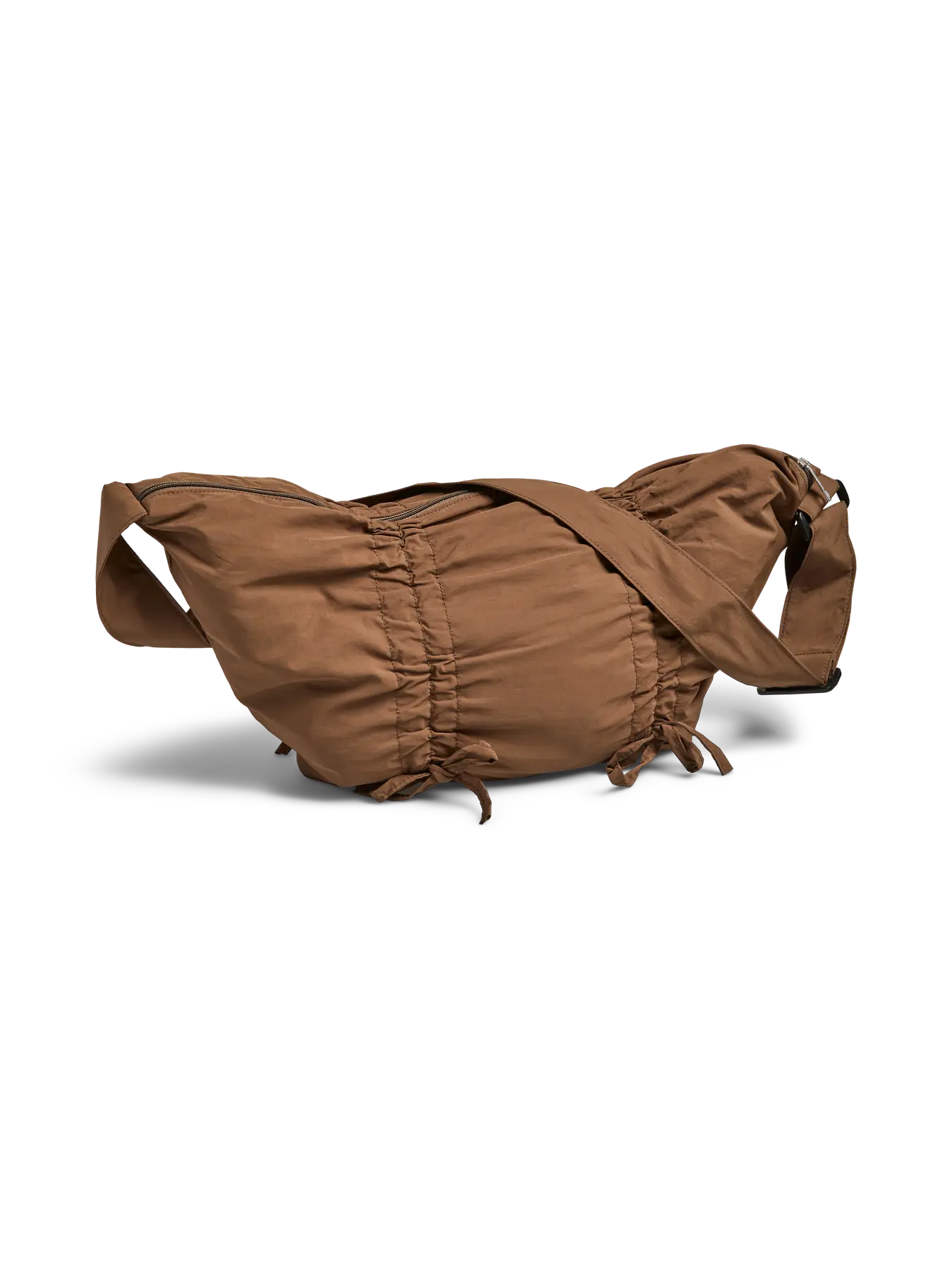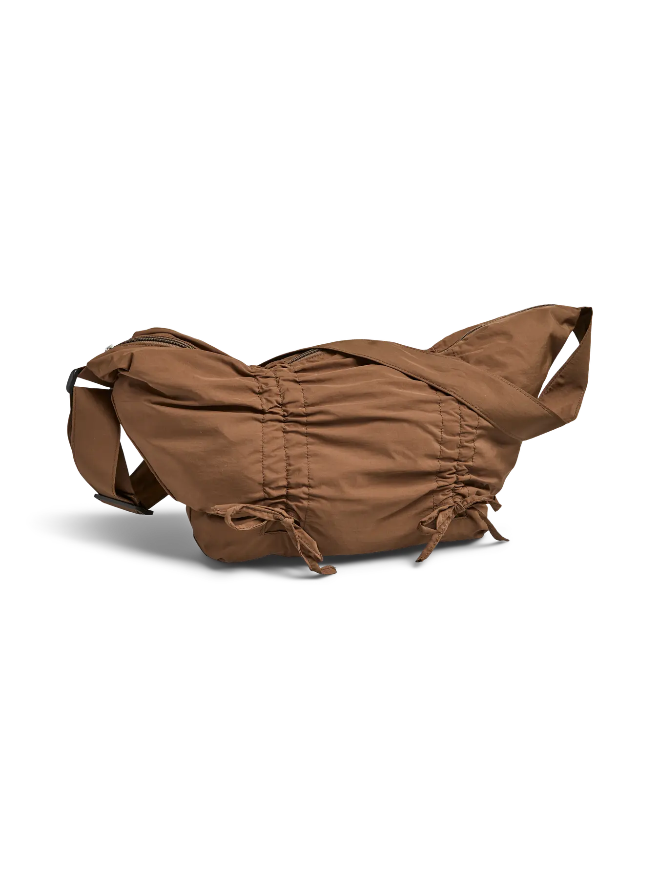 Mooie bruinkleurige XL bumbag met een uniek design door de trekkoorden en strikdetails aan de voorkant, wat zorgt voor een geplooid effect. Deze ruime tas heeft een halfronde vorm en is ideaal voor dagelijks gebruik. Afmetingen: 33 cm lang, 49 cm breed en is 100% polyester.