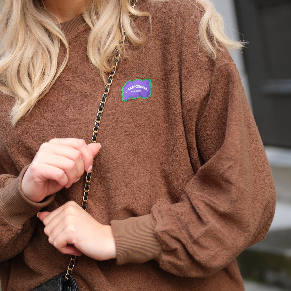 Deze Badstof Sweater is de perfecte trui voor een relaxte en comfortabele dag. De sweater is gemaakt van zachte badstof, wat zorgt voor een unieke textuur en een heerlijk gevoel. De diepe, levendige bruine kleur en de ronde hals met V-detail geven de trui een sportieve vibe. De kleine, kleurrijke 'California' patch op de borst maakt de casual look compleet.