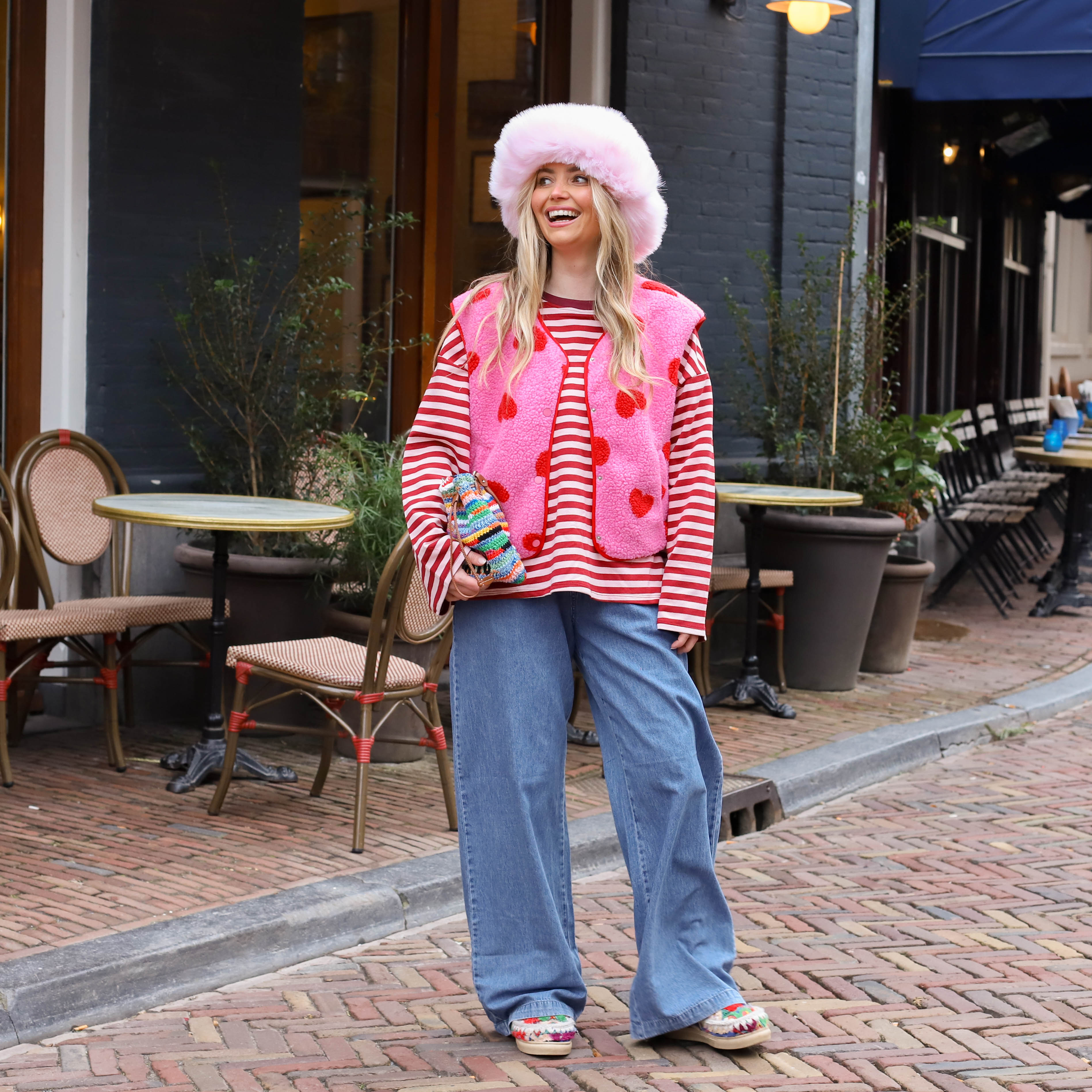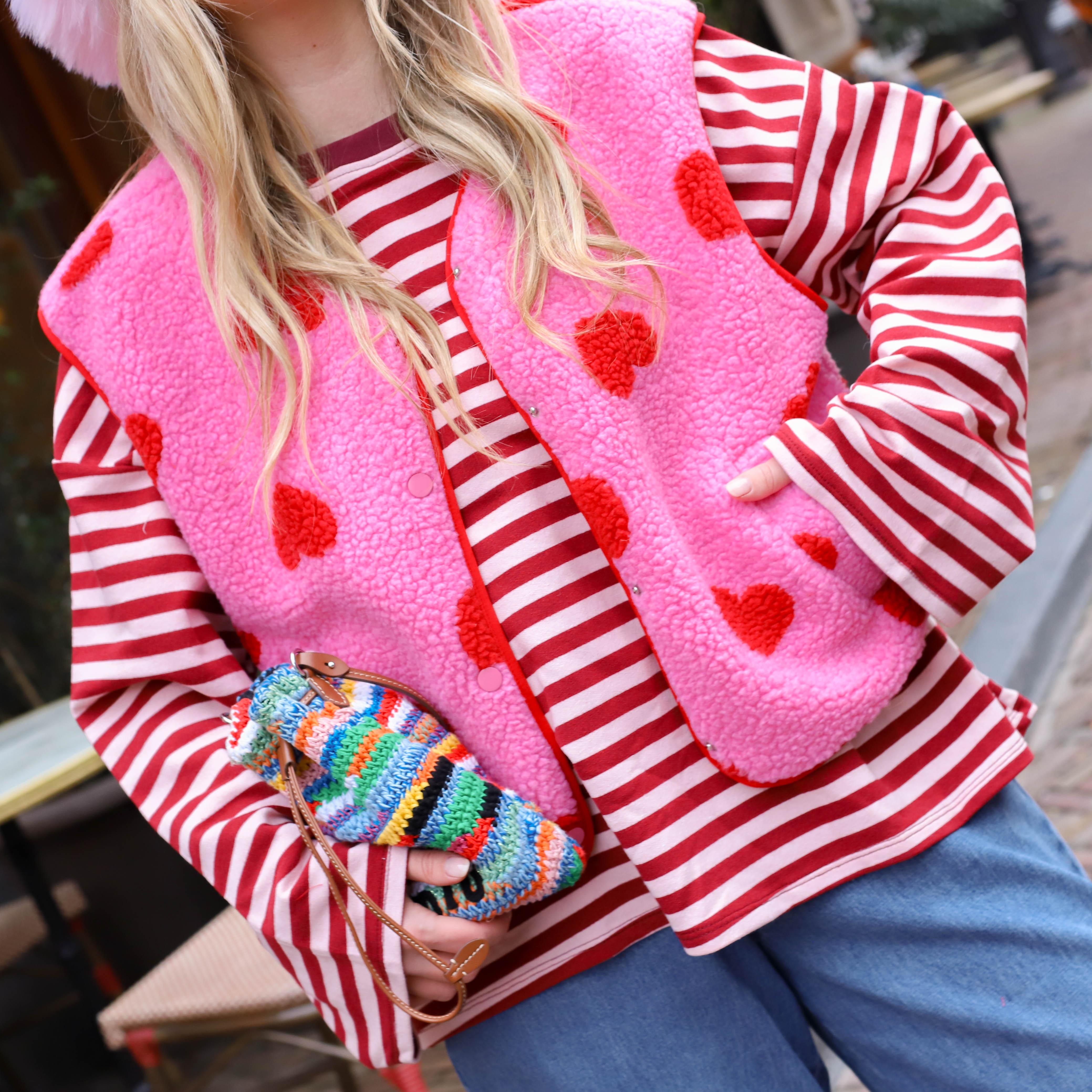 Dit Gilet Red Heart is een mega schattige eyecatcher die je outfit direct een vrolijke upgrade geeft! De bodywarmer heeft een heerlijk zachte teddy-structuur en valt op door het all-over hartjespatroon en de contrasterende biesjes. Met de handige drukknoopjes en de relaxte fit is dit het perfecte item om te layeren over een basic sweater of een oversized shirt voor die on-trend streetwear vibe.