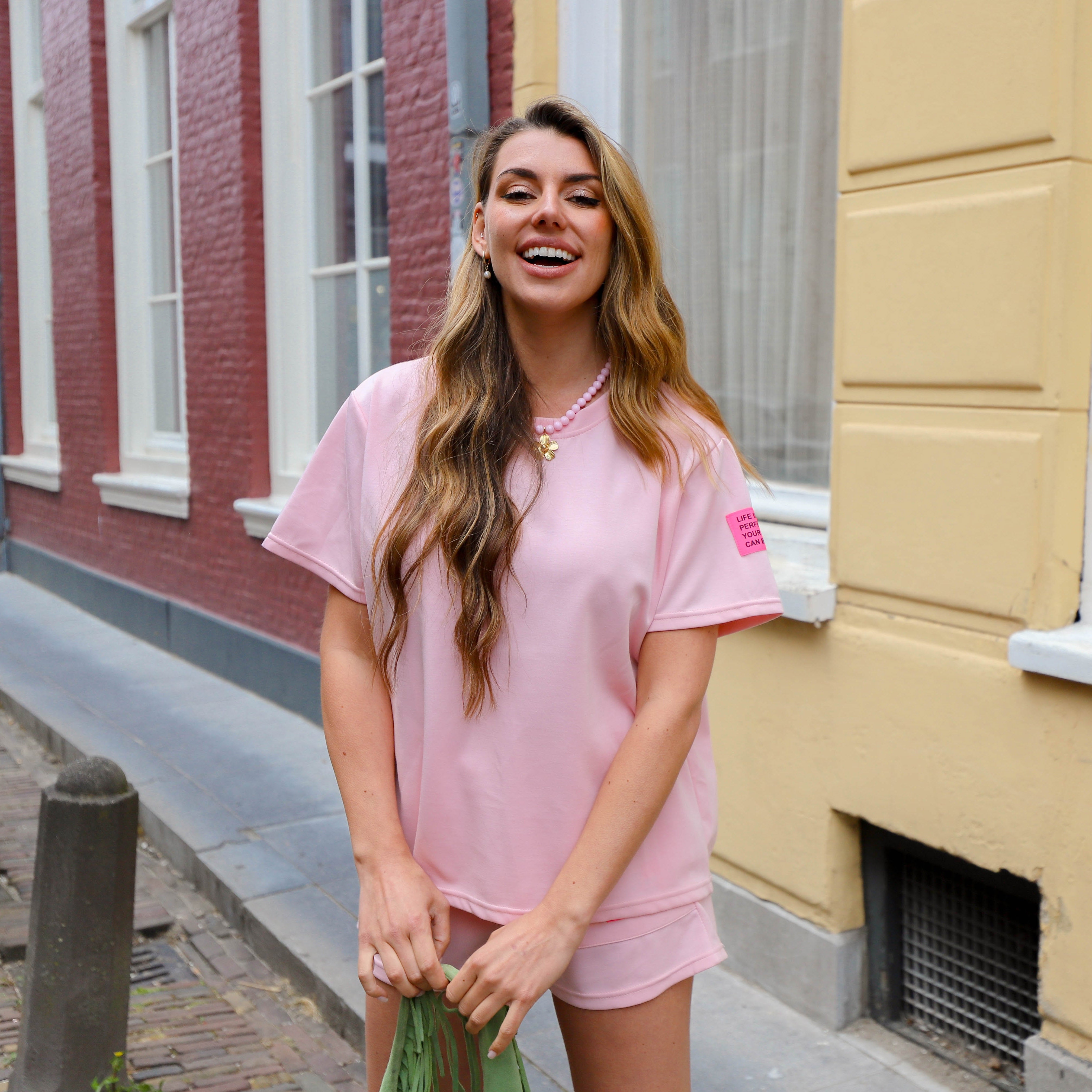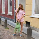 Ontdek ultiem comfort en een relaxte stijl met onze zachte Jogging Set! Deze tweedelige set, bestaande uit een T-shirt en een bijpassende short, is uitgevoerd in een subtiele lichtroze melange. De set is gemaakt van een zachte en comfortabele stof, perfect voor luie dagen thuis, een wandeling in het park, of als comfortabele reisoutfit. Het T-shirt heeft een casual pasvorm met korte mouwen, en de short is voorzien van een elastische tailleband met een opvallend neonroze trekkoord voor een speels accent en een perfecte pasvorm. Een klein label op de short voegt een uniek detail toe.