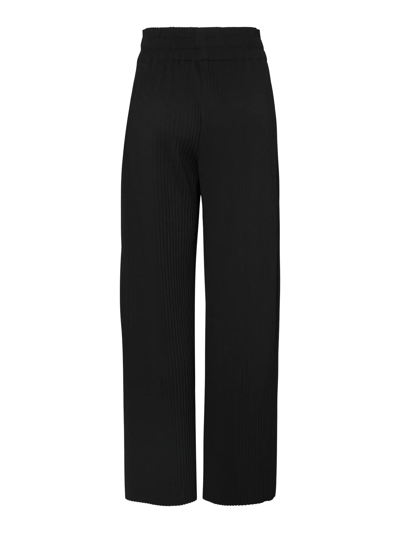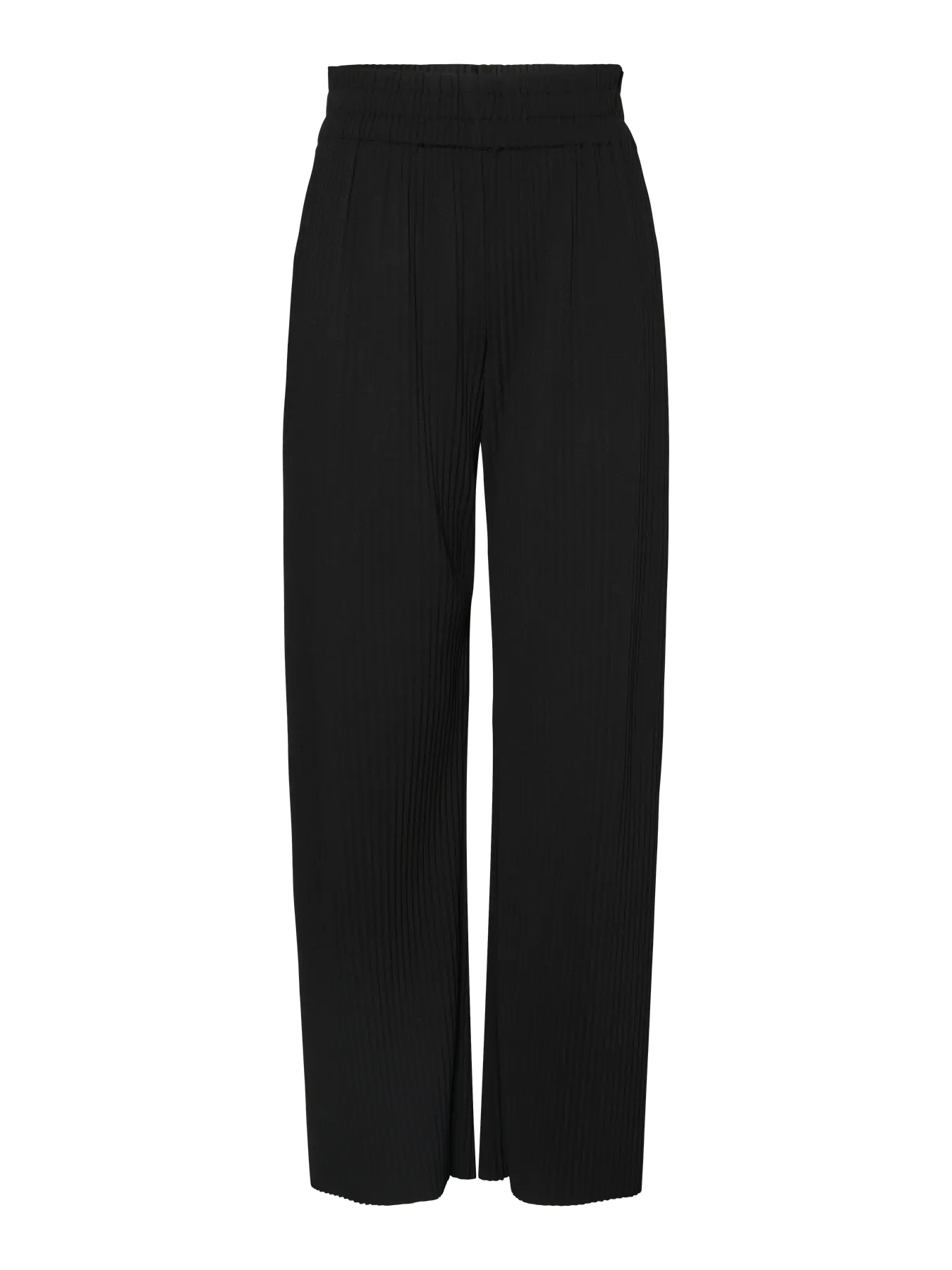 Mooie zwarte high-waist broek met een plissé textuur. Deze comfortabele broek heeft een elastische tailleband en is gemaakt van gerecycled polyester met stretch voor een perfecte pasvorm.