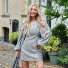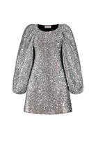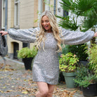 De Shimmer Dress is de party dress voor de komende feestelijke dagen. Het materiaal is all over gecovered in zilveren pailletten. Door de licht gepofte vorm en subtiele plooien bij de schouders krijgen de mouwen een speelse, maar luxe uitstraling. Aan de manchetten zit elastiek, waardoor je de mouwen ook weer omhoog kan stylen. De hals is rond en aangesloten.