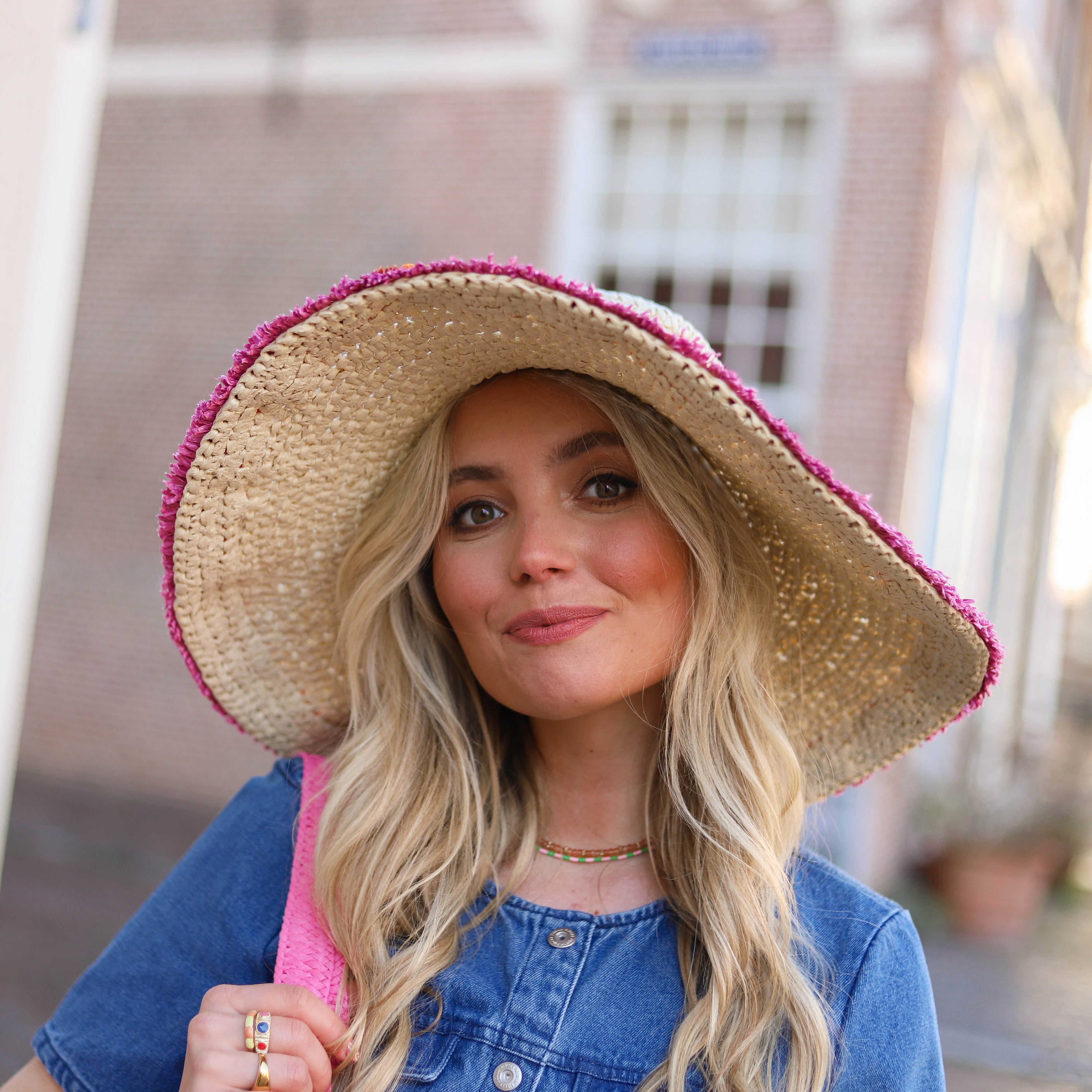 Mooie hoed van stro met oranje details aan het uiteinde. Fleurt elke outfit op!