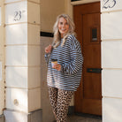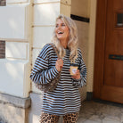 De Charlie Streep Sweater is een comfortabele en veelzijdige trui met een speels gestreept patroon in blauw bruin. Deze sweater heeft een rechte, oversized pasvorm en een ronde hals. De lange mouwen en zachte stof geven het item een casual uitstraling, terwijl de fijne strepen zorgen voor een subtiele en vrolijke look.