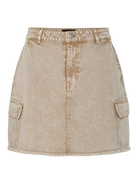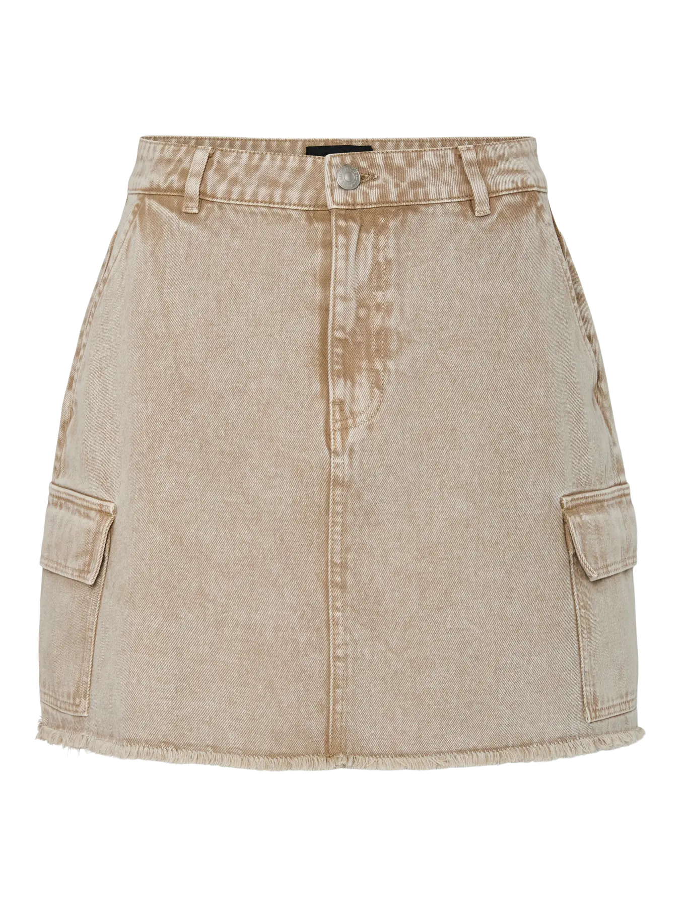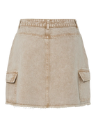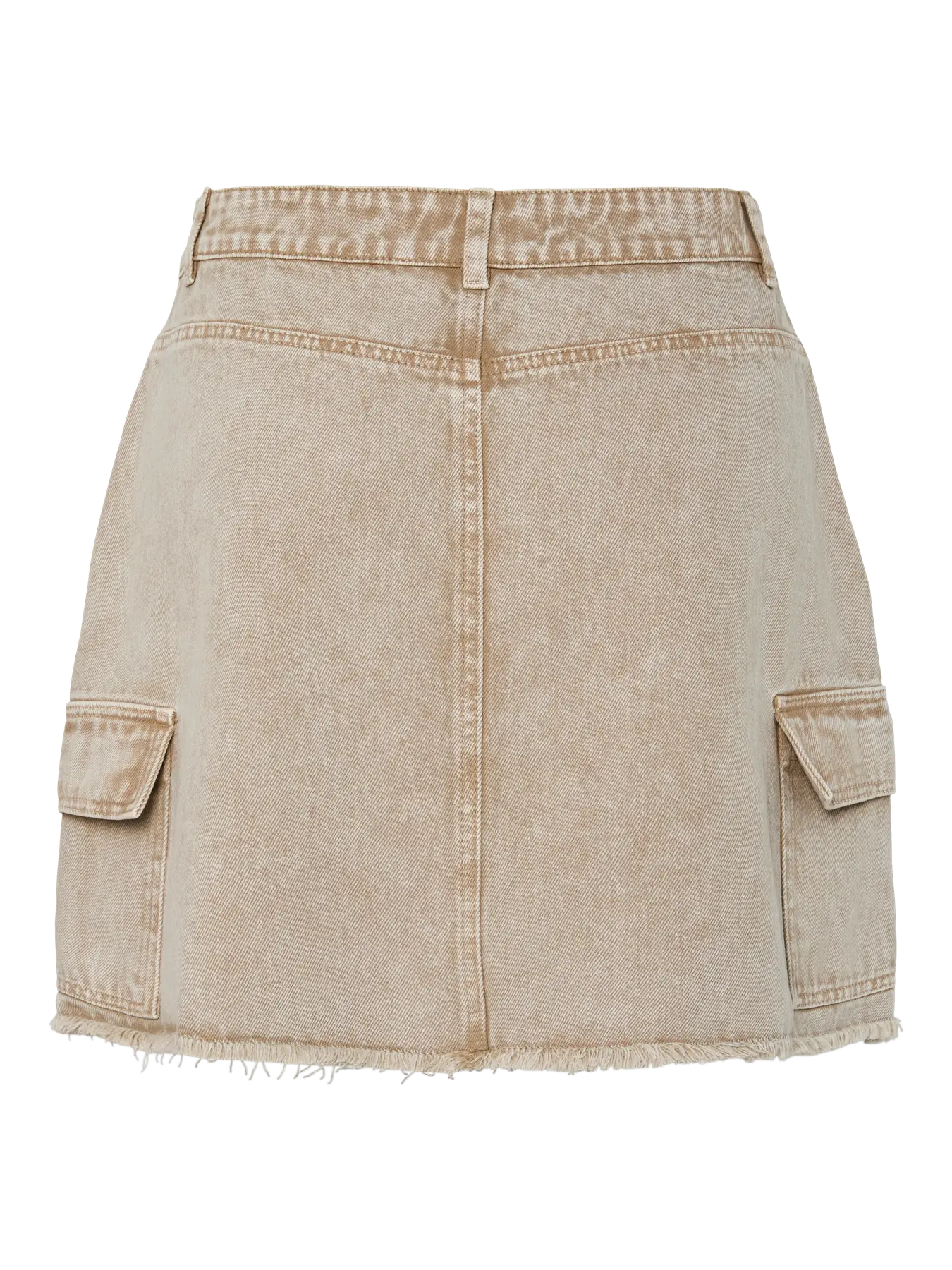 Mooie beige cargo mini denim rok met een verwassen look en een gerafelde zoom. De rok heeft opgestikte zakken aan de zijkant, wat zorgt voor een stoere uitstraling.