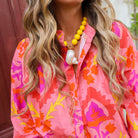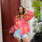 Deze levendige 'Formentera blouse roze' is een opvallende blouse met een basis van zalmroze, versierd met een dynamisch bloemenpatroon in tinten van oranje, fuchsia en geel. De print geeft de blouse een energieke en vrolijke uitstraling. De blouse heeft een staande kraag en een knoopsluiting aan de voorkant, en lange mouwen met manchetten.