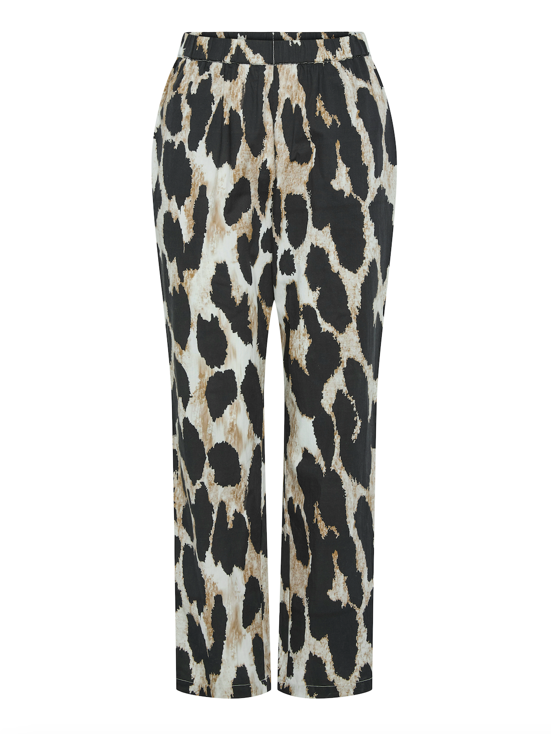 Mooie broek van panterstof in het bruin met zwart. De broek heeft een hoge taille en staat leuk met de bijpassende blouse.