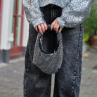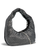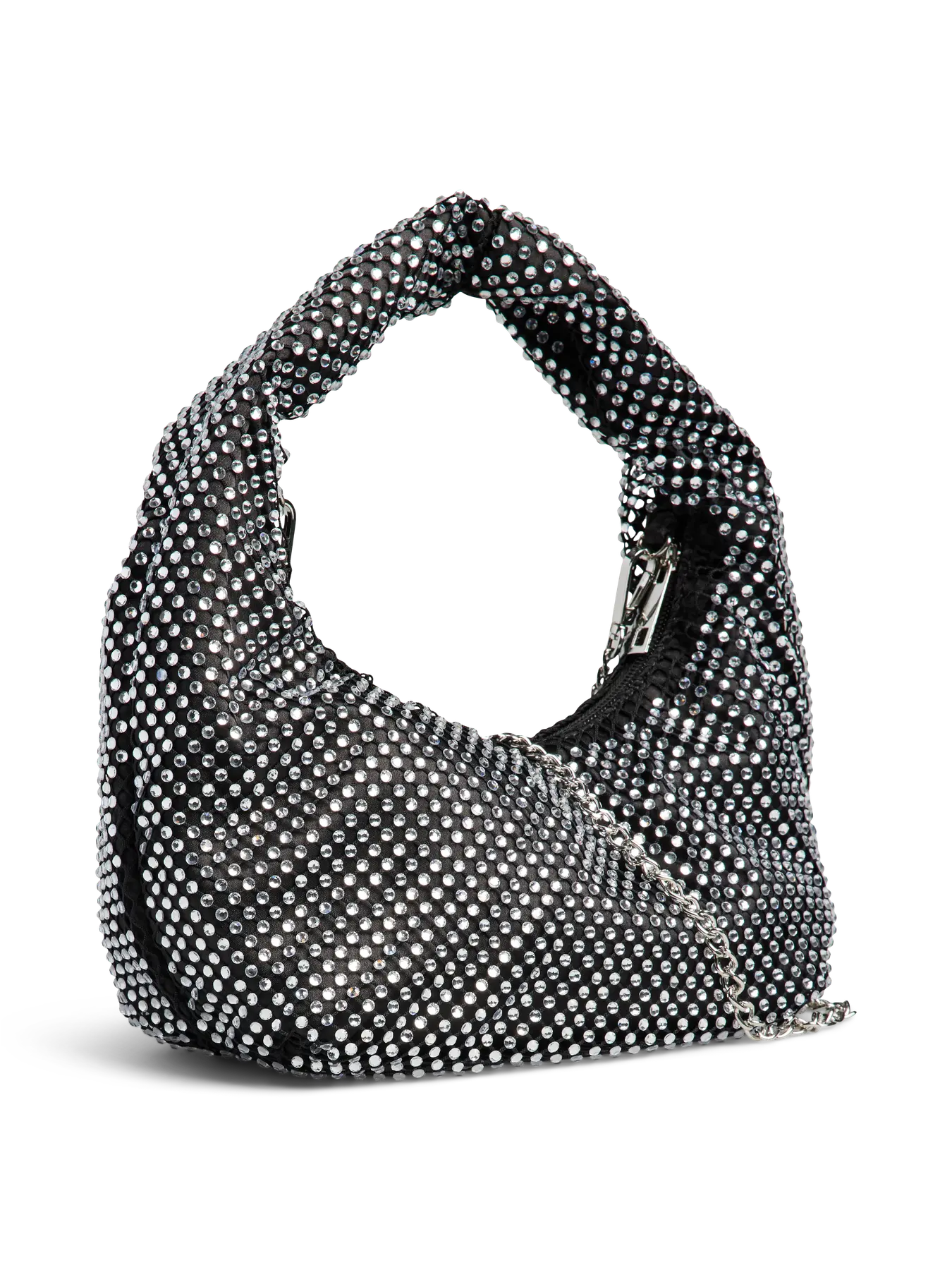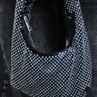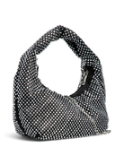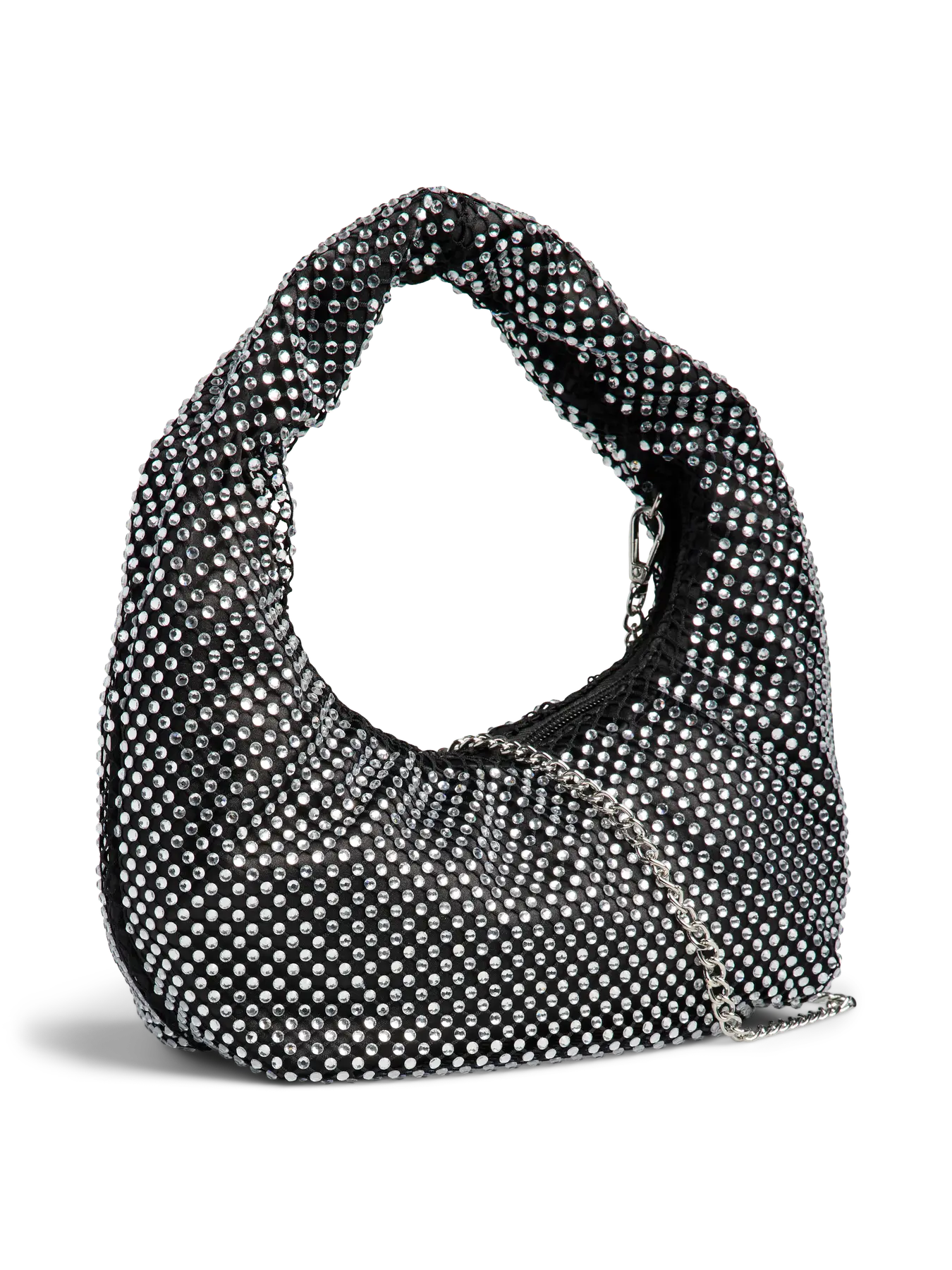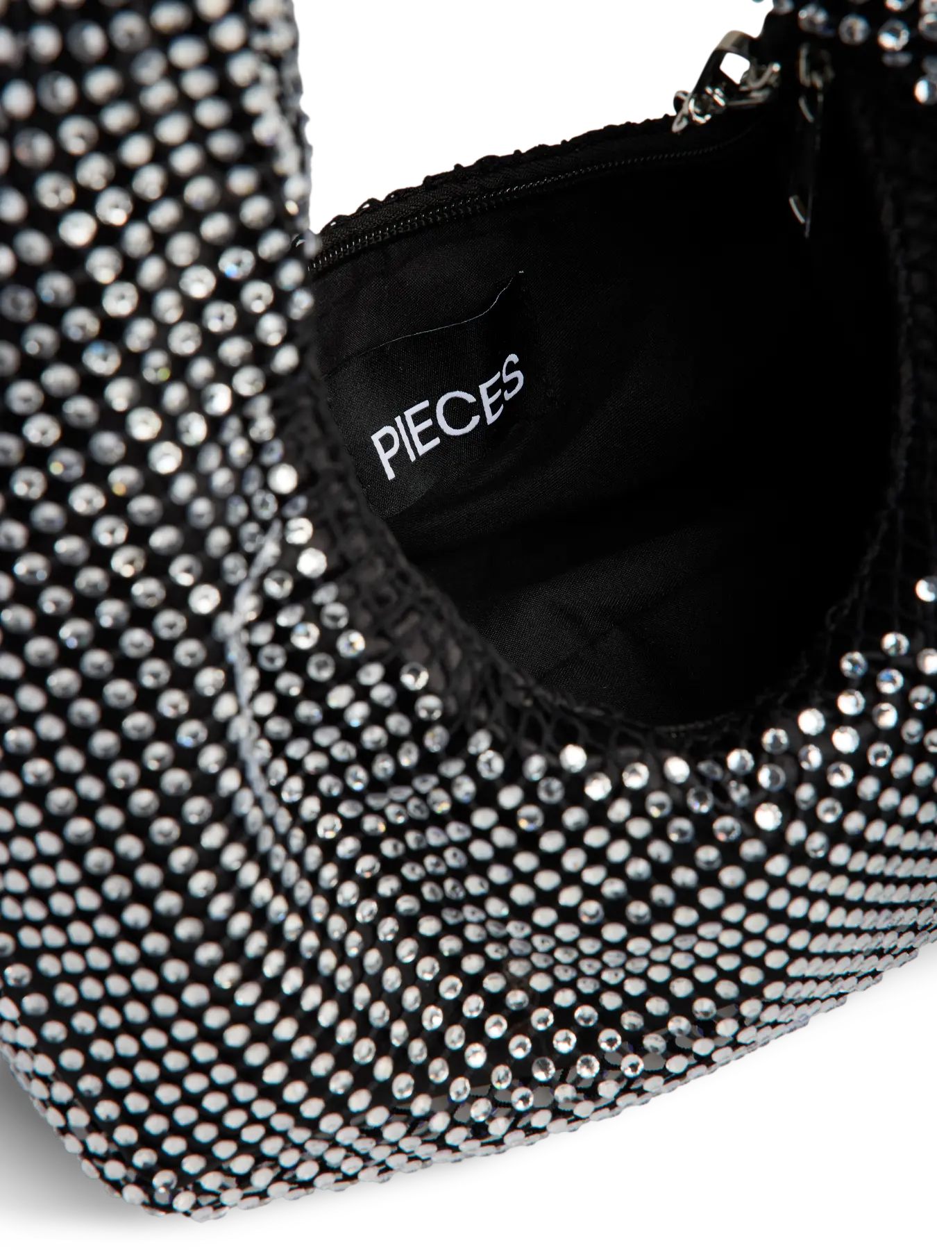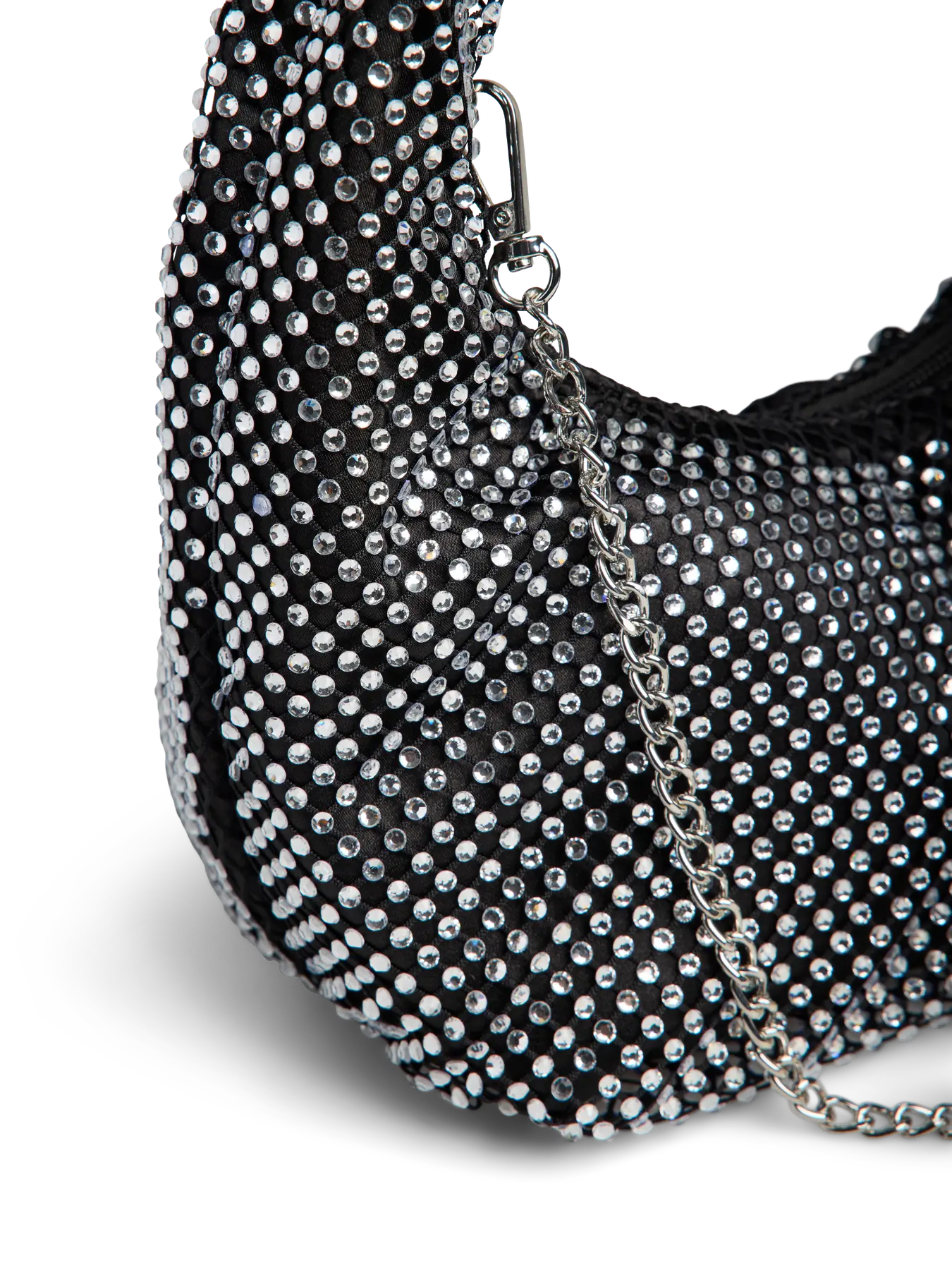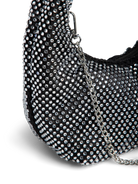 Deze PCJANNA Bag is een glamoureuze en opvallende accessoire voor elke avondlook of feestje. De tas heeft een trendy, gebogen 'baguette' of 'hobo' vorm en is volledig bedekt met schitterende zilverkleurige strass-steentjes.