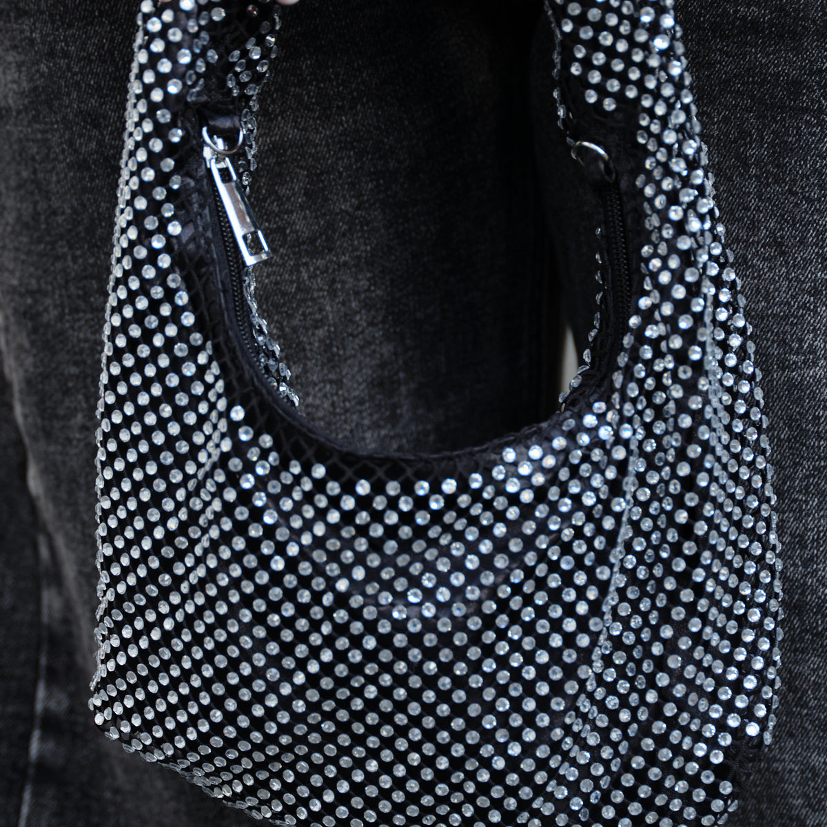De handgreep is eveneens volledig bedekt met steentjes, waardoor de tas prachtig fonkelt in het licht. De compacte maar opvallende afmetingen maken deze tas perfect voor het meenemen van je essentiële items, en het is de ultieme finishing touch voor een feestelijke outfit.