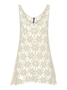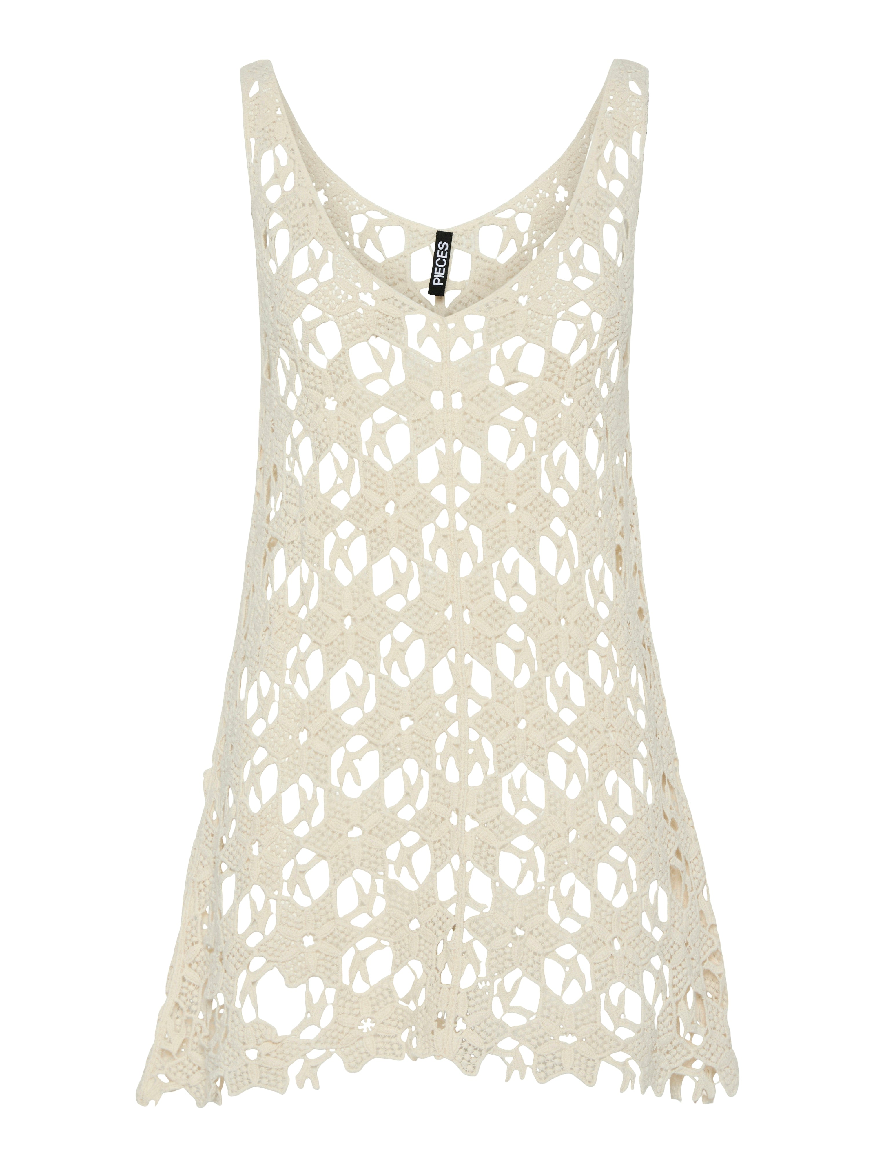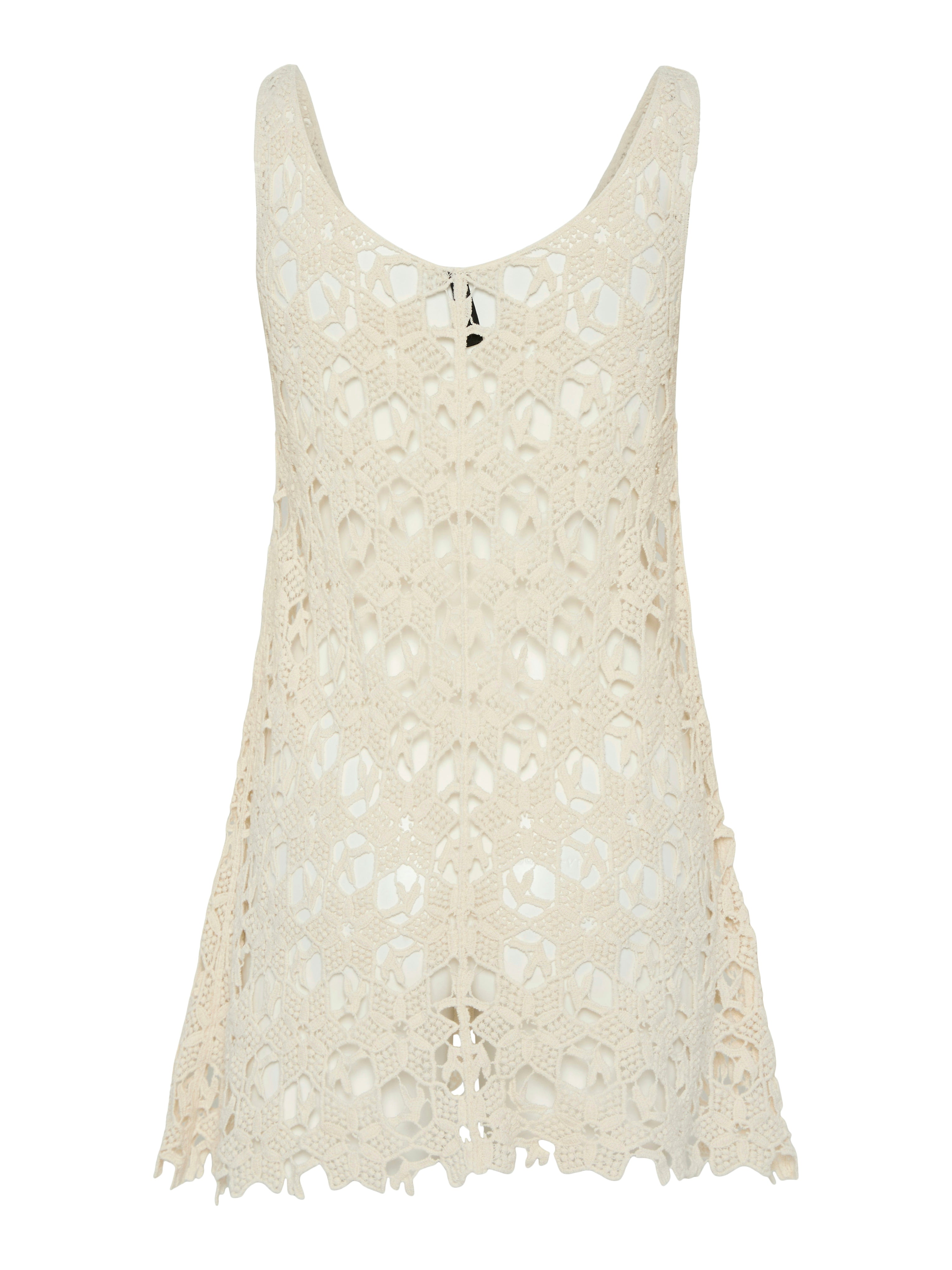 Mooie ecrukleurig jurkje van crochet materiaal. Het jurkje heeft een v-hals en staat leuk met een paar leuke laarsjes.