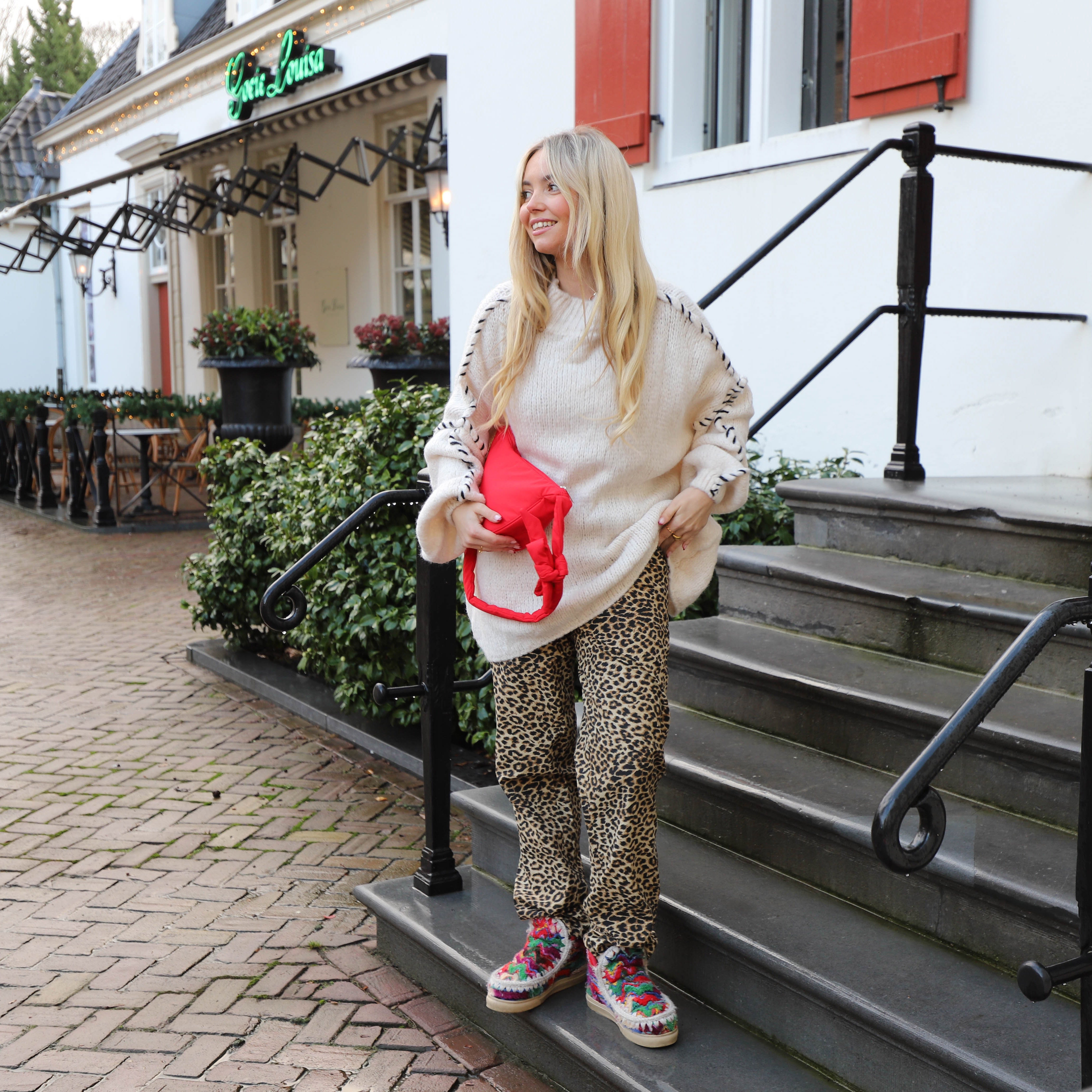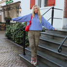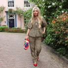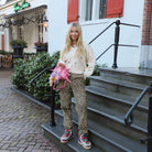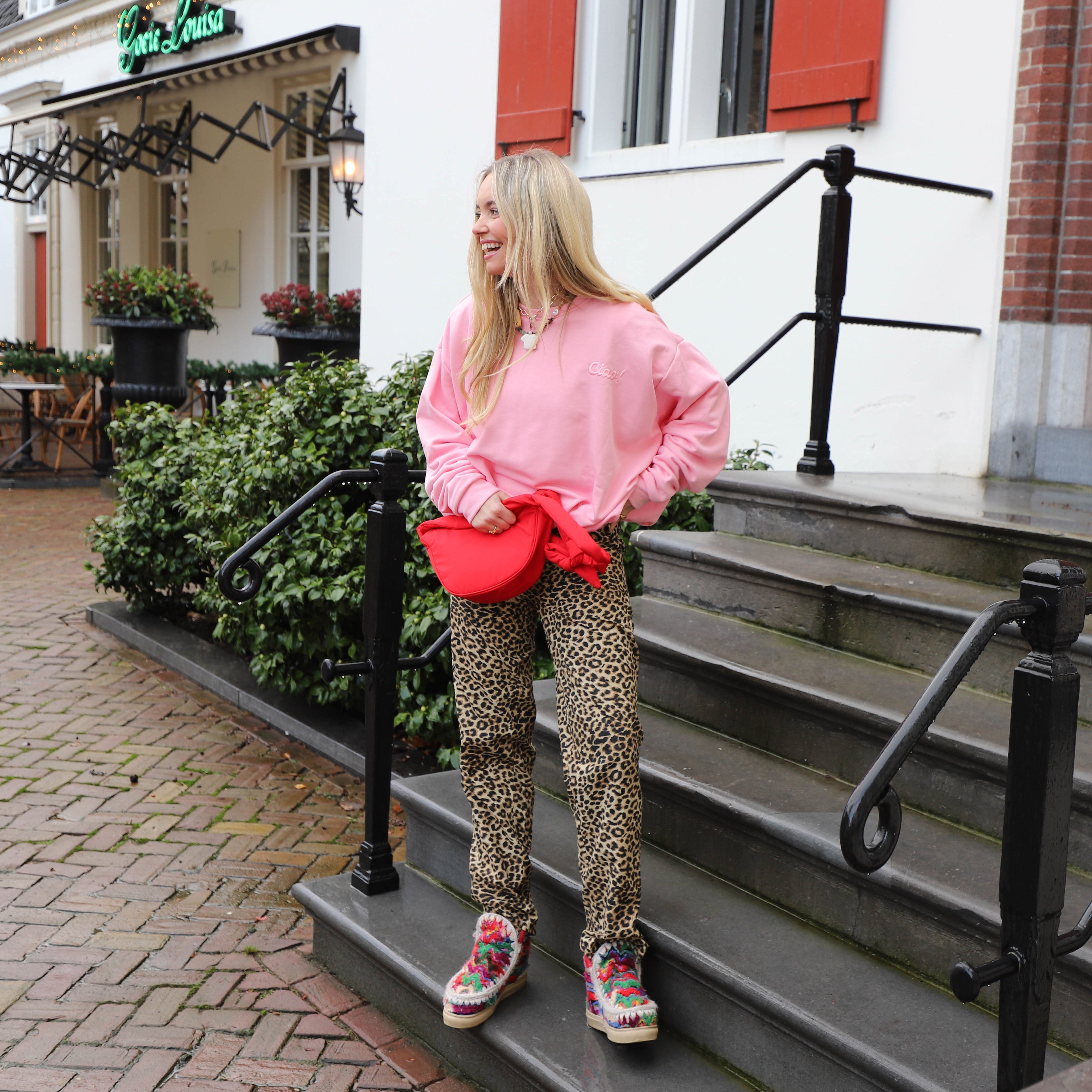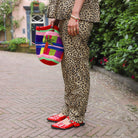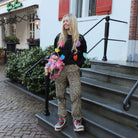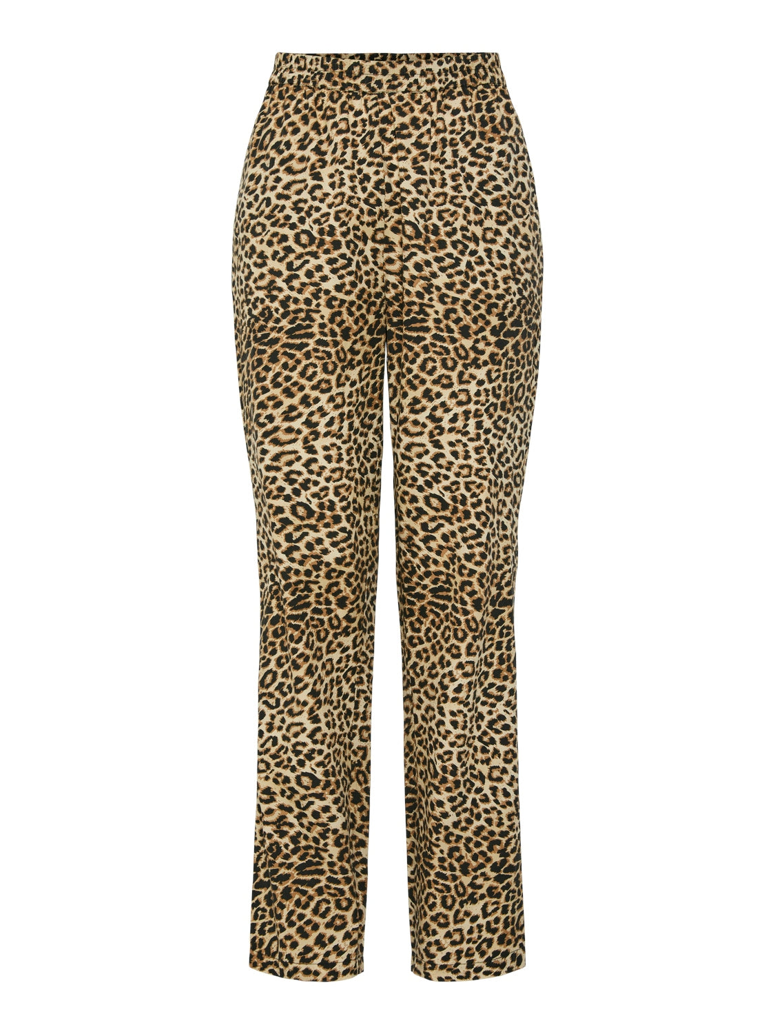 Mooie hight waisted leopard broek. De broek heeft een beige bruine zwarte print en een hoge taille. De broek heeft wijde pijpen en staat leuk met het bijpassende bloesje.