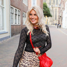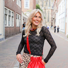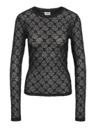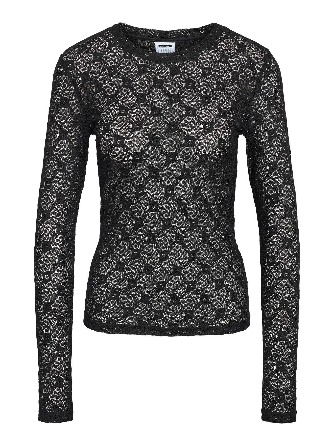 Deze delicate zwarte top is gemaakt van prachtig kant en heeft een aansluitende pasvorm en lange mouwen, perfect om te dragen onder een blazer of op zichzelf voor een verfijnde look. Het verfijnde patroon van het kant en de hoge halslijn zorgen voor een romantische en vrouwelijke uitstraling.