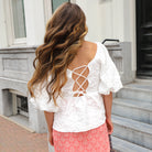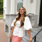 Deze romantische 'PCSALLY Puff Slegers' top is een stijlvolle essential die je look direct een elegante en vrouwelijke touch geeft. De top is uitgevoerd in een klassieke witte kleur en valt op door de unieke crinkled textuur, wat zorgt voor een speels en dynamisch effect. De brede, elastische halslijn kan zowel off-shoulder als als een wijde boothals gedragen worden, wat zorgt voor veelzijdigheid. De korte, volumineuze pofmouwen en het open rugdetail met gekruiste bandjes maken deze top perfect voor een zwoele zomeravond of een stijlvolle gelegenheid.