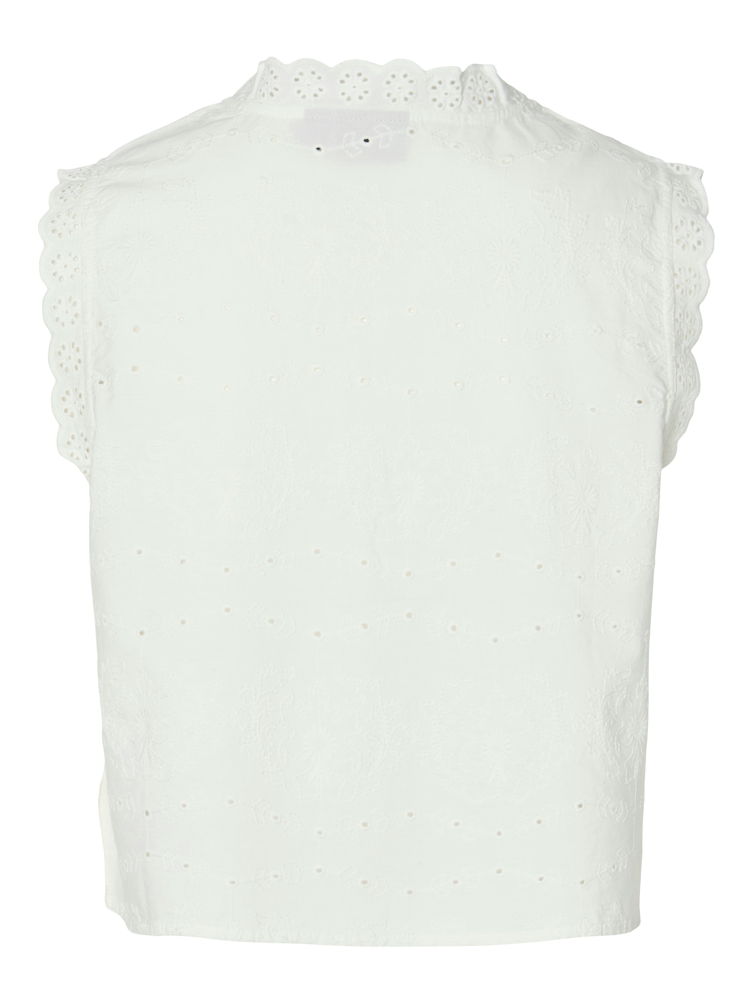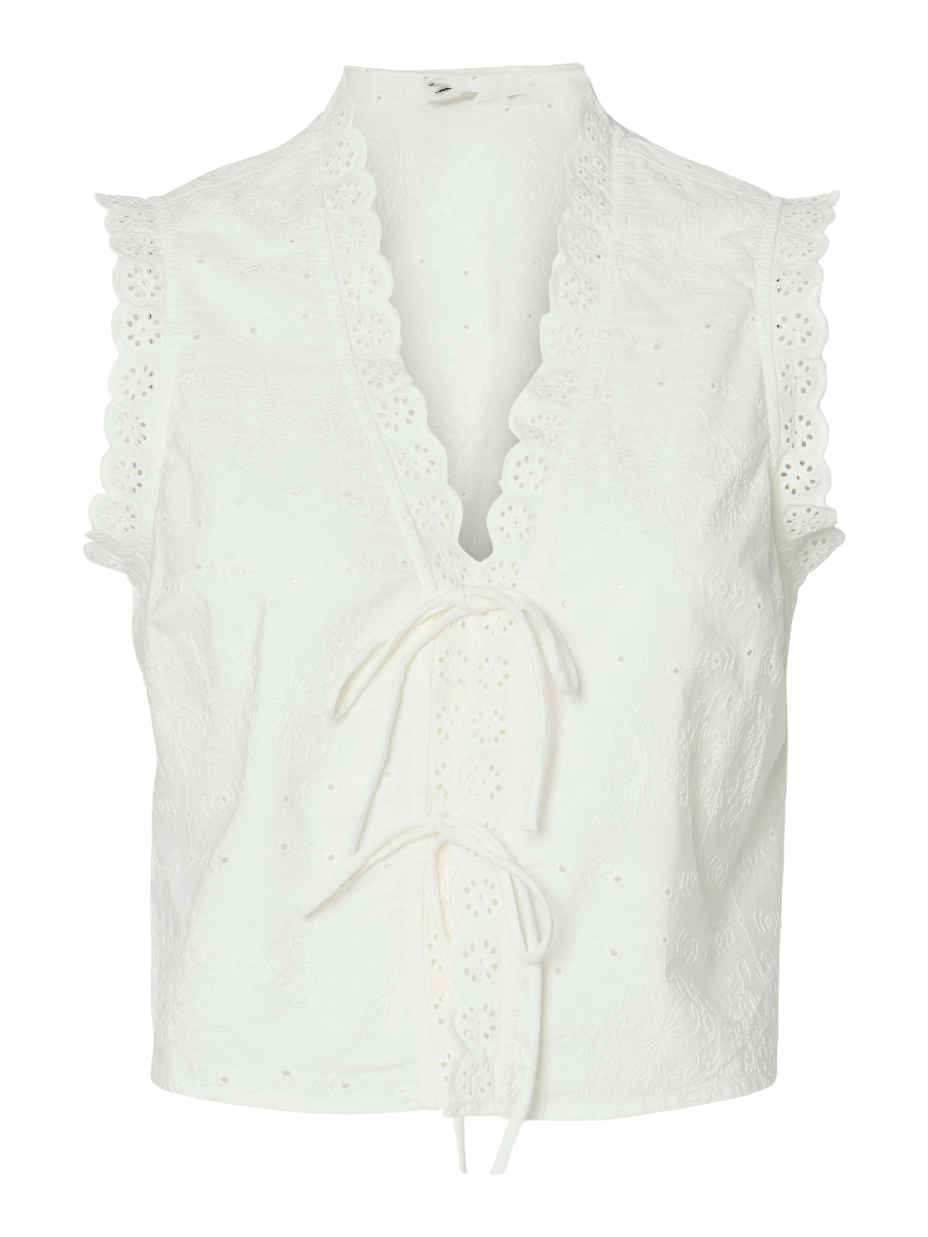 Mooie witte blouse met broderieprint. De blouse is te strikken aan de zijkant en staat leuk met een beige broek.