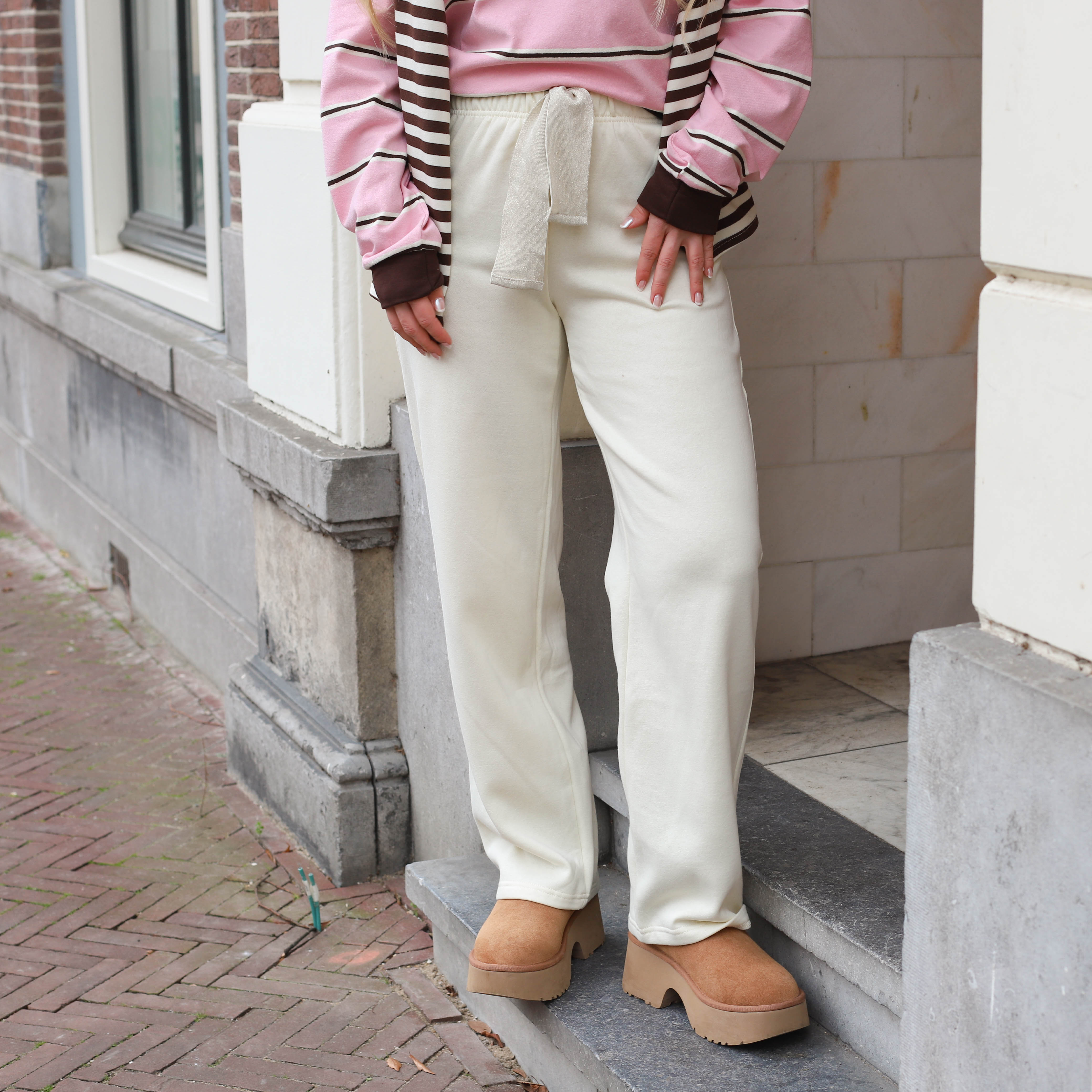 Deze broek is uitgevoerd in een klassieke witte kleur en heeft een wijde pijp, wat zorgt voor een moderne en comfortabele pasvorm. De taille is voorzien van een elastische boord met een opvallend glitter trekkoord dat een speelse en trendy touch toevoegt.