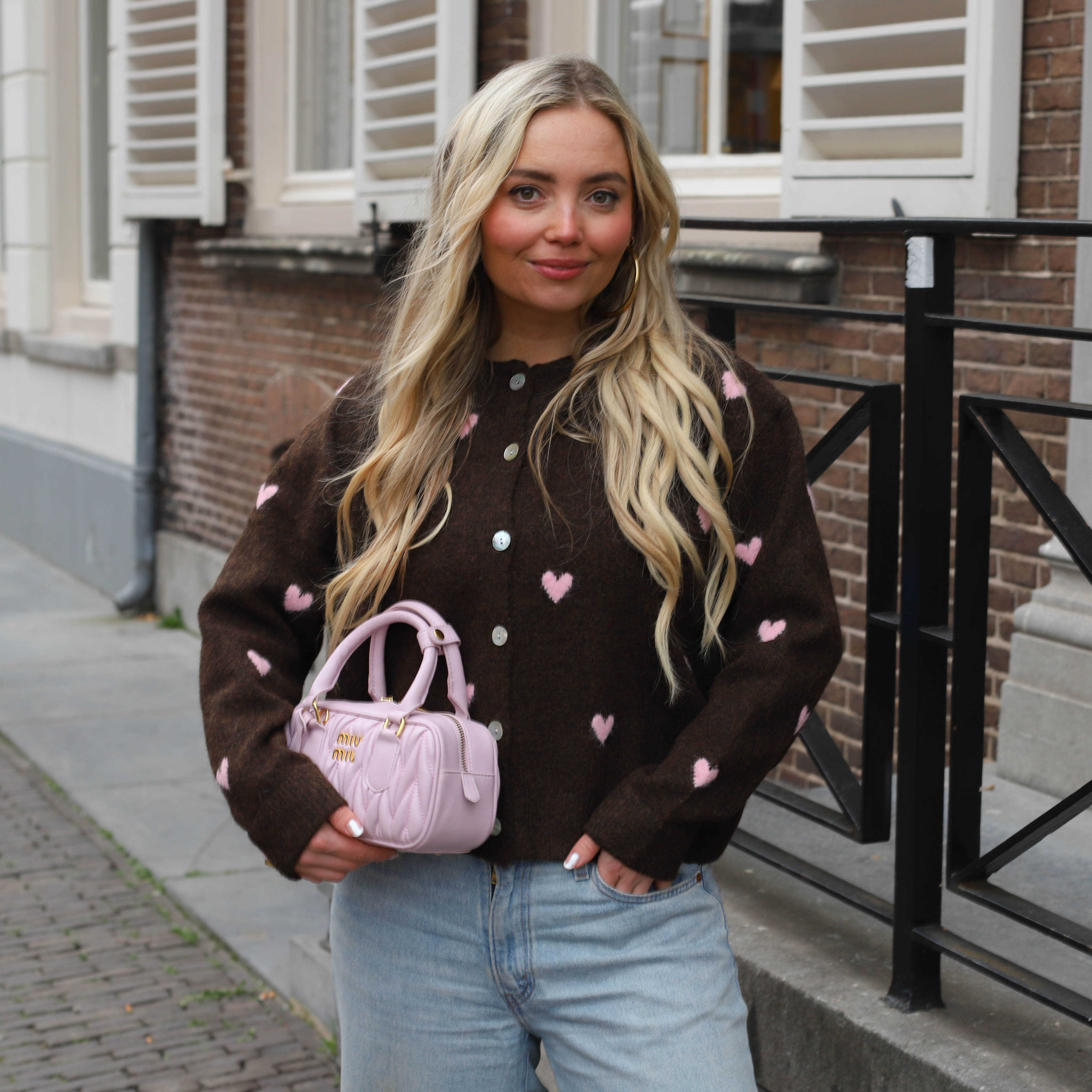 Deze Love Cardigan is een zacht en speels gebreid vestje. Het vest is gemaakt van een harige, bruine gebreide stof en heeft een all-over patroon van kleine, ingebreide bruine hartjes. Het vest heeft een klassieke ronde hals, een knoopsluiting en een korte, boxy pasvorm.