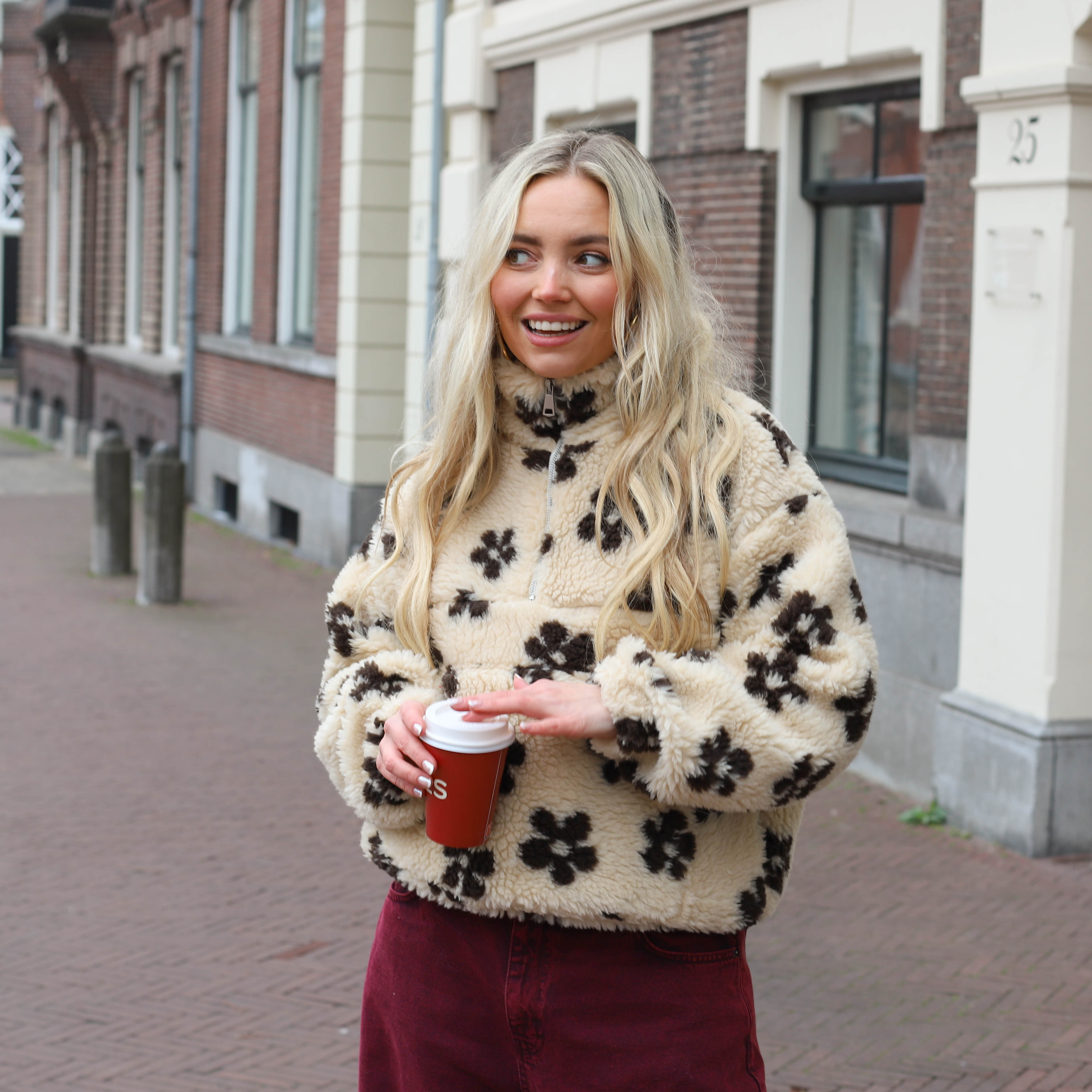 Deze heerlijk zachte en speelse Teddy Fleece Trui is de perfecte trui om je warm en vrolijk te houden. De trui is gemaakt van een zachte, bruine teddy fleece stof en is voorzien van een opvallend, all-over patroon van bloemen. De hoge kraag met korte ritssluiting, de comfortabele buidelzak aan de voorkant en de elastische boord aan de onderkant geven deze trui een casual en behaaglijke look.