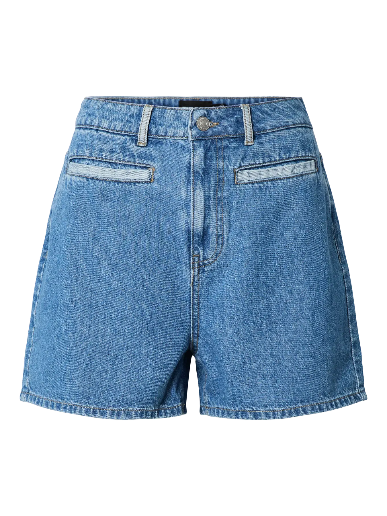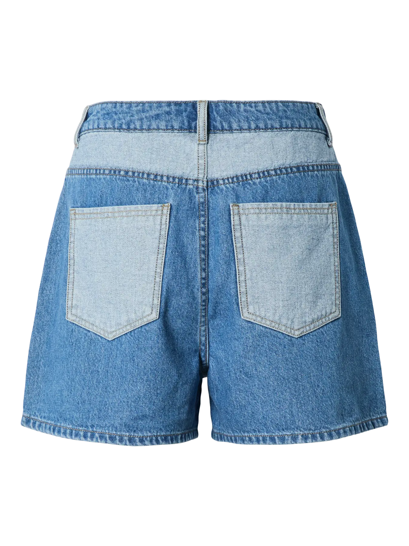 Upgrade je zomergarderobe met onze trendy Fie Patchwork Denim Short! Deze stijlvolle denim short heeft een klassieke blauwe wassing en is verrijkt met subtiele patchwork details aan de zakken, wat zorgt voor een moderne en unieke twist. De hoge taille en de comfortabele pasvorm maken dit de perfecte short voor diverse zomerse looks. Ideaal om te combineren met je favoriete tops en T-shirts.
