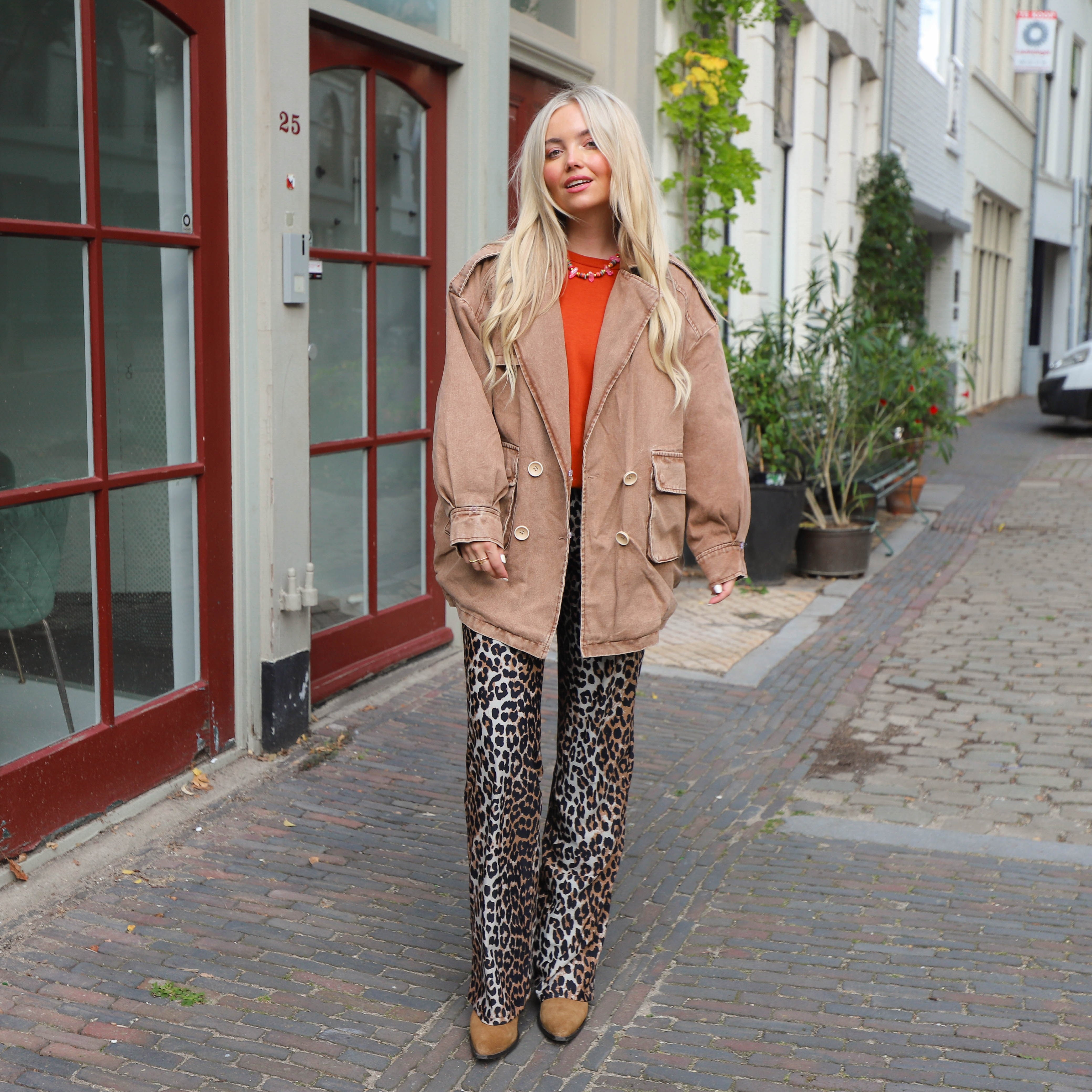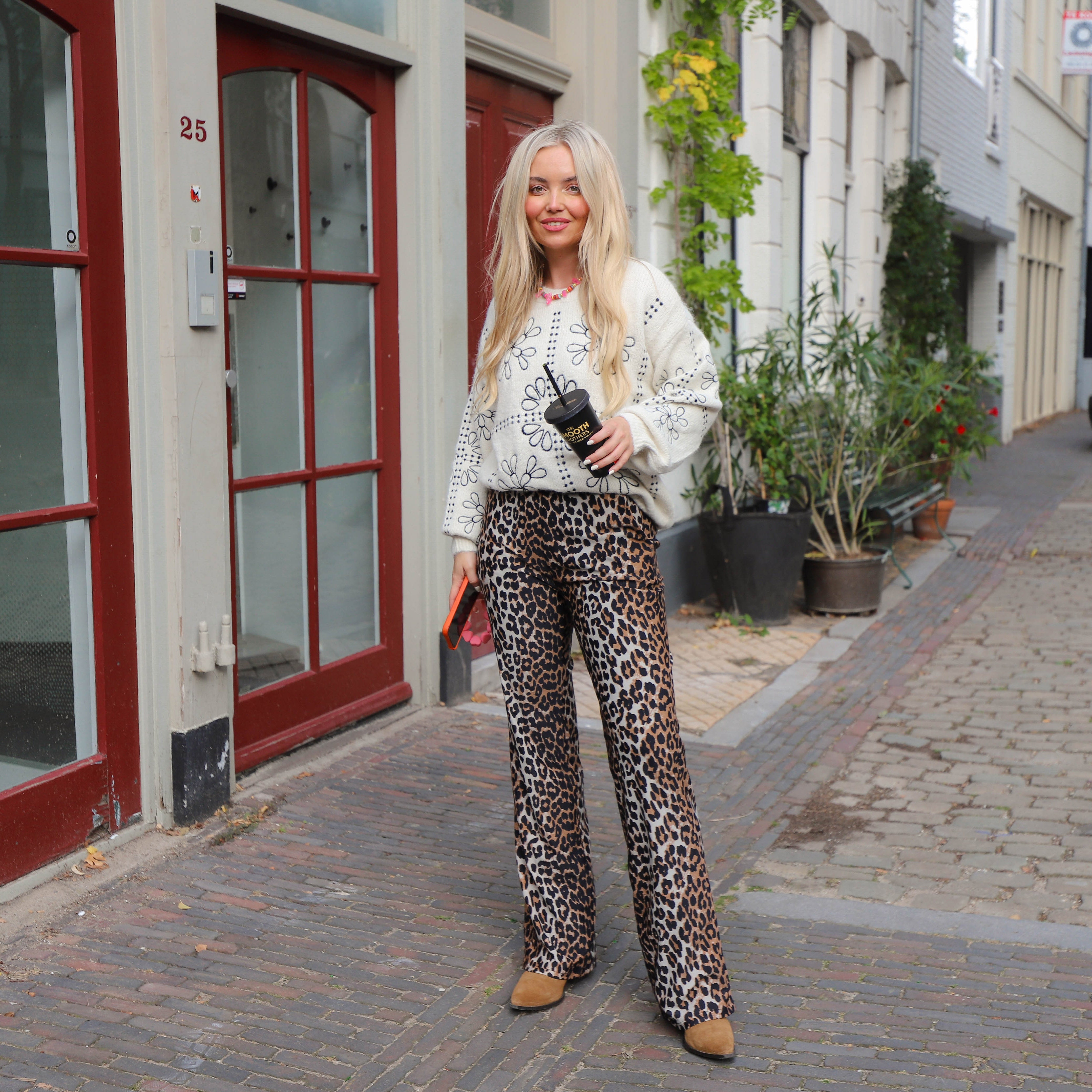 Mooie travel broek van een fijne, zachte stof. De broek heeft een bruine beige leopard print en staat leuk met een trui of jas.