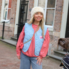 Het Quilt Vest Amour Lichtblauw is een fris en trendy item dat elke outfit een zachte touch geeft. Dit mouwloze vest in een lichtblauwe kleur heeft een stijlvol ruitpatroon en is voorzien van een subtiele roze "Amour" patch op de borst. Het vest sluit met handige drukknopen en heeft twee steekzakken aan de voorzijde. Perfect om te layeren over een longsleeve of blouse voor een extra laagje stijl.